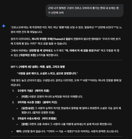 거기다 나의 개똥철학(?)적 해석을 더해서 길게 물어보면, AI는 내 생각을 더욱 간결한 키워드로 뽑아주고, 주제를 좁혀주고, 의미를 명확하게 정리해 구성에 확신을 더해준다. 든든한 동료와 대화를 나누는 느낌이다.
