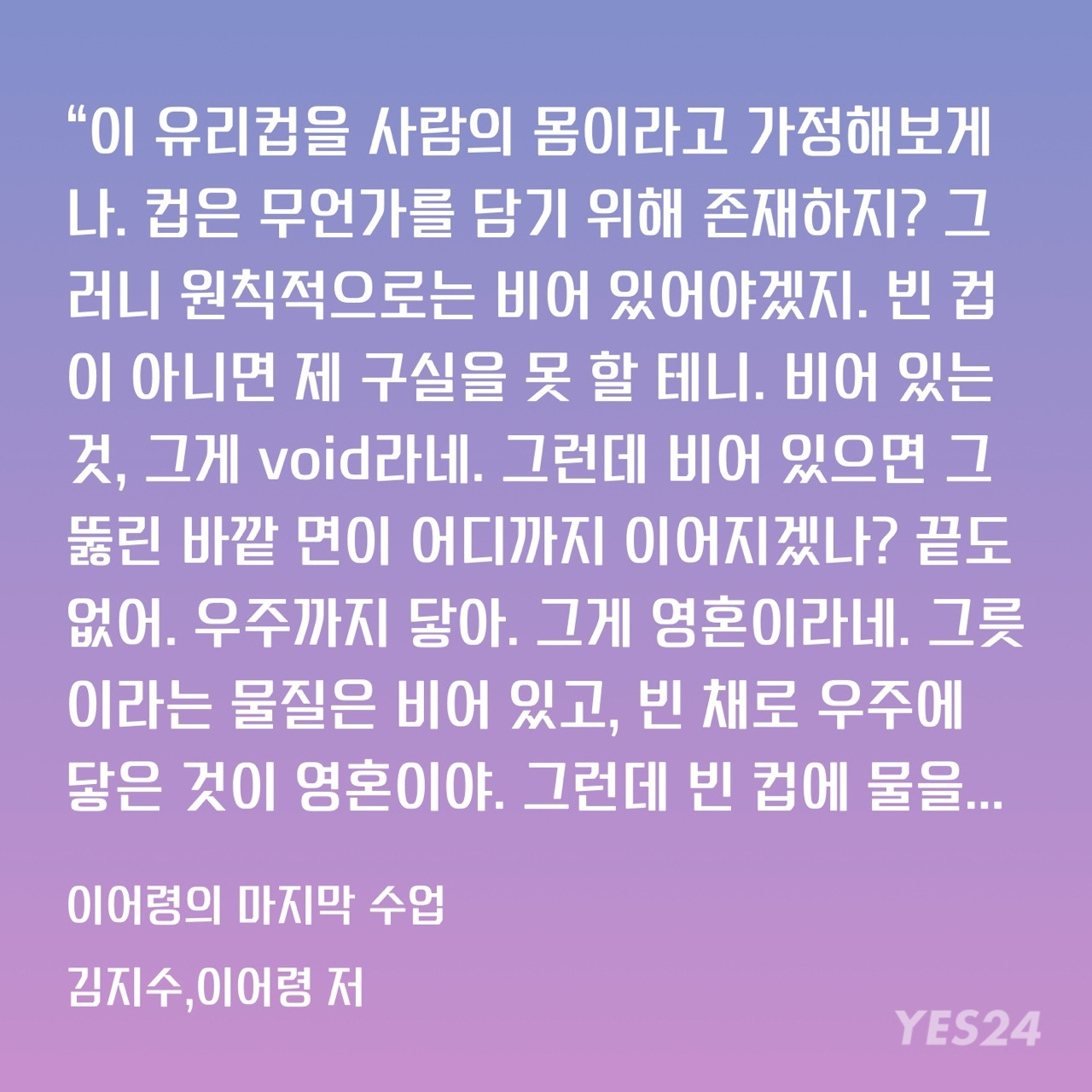 컵은 담기 위해 존재하지만, 빈 컵이 아니면 제 구실을 못한다라니. 이 얼마나 큰 역설입니까? 나는 담기 위해 존재하는 줄 알았는데, 내가 비어 있을 때 우주를 담을 수 있게 되는 것을 깨달았습니다. 즉, 나의 역할(=담다)에 충실하려고 노력하기보다는 나의 본질(=빈 컵)을 인지하는 것이 우선되어야 한다는 것을요.