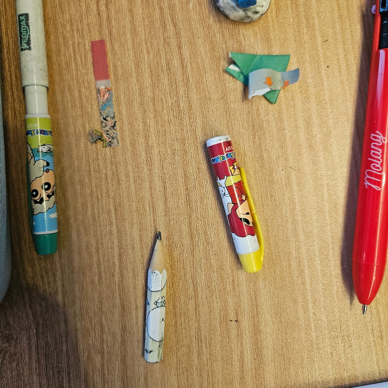 고장 난 볼펜, 먼지가 달라붙어 안 지워지게 생긴 지우개.. 그리고 알 수 없는 쓰레기들.