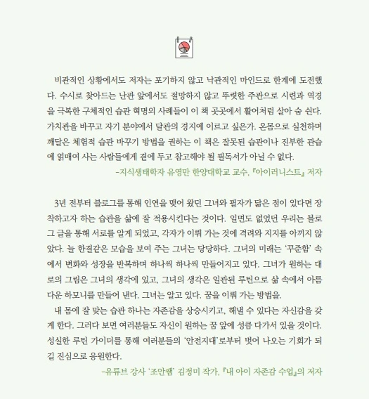 이 책은 저자가 오랜 시간 습관을 실천하면서 겪은 노하우를 책으로 집필했다.