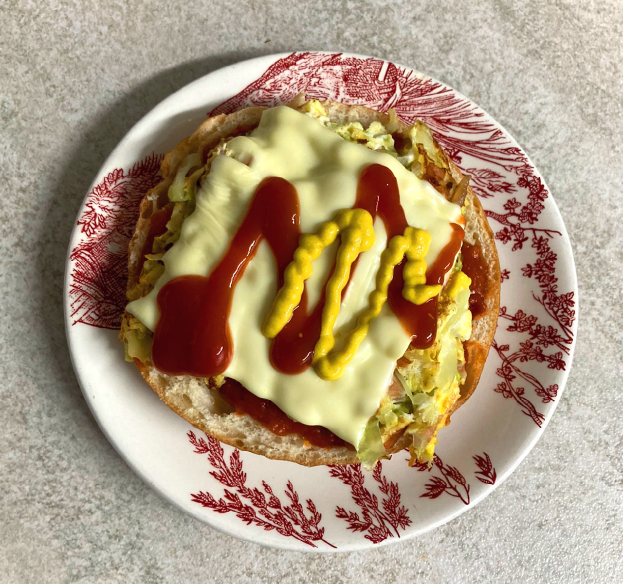 마지막으로 베이글 위에 저염 치즈 한 장을 올리고 토마토&머스터드 소스를 뿌려 마무리했어요.