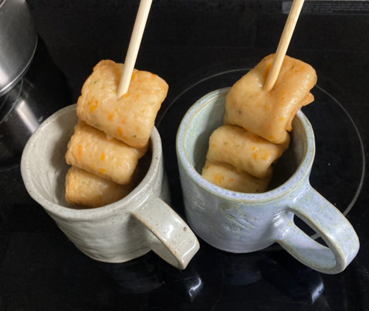 마지막으로, 오래전에 취미로 만든 도자기 컵에 국물을 담아 어묵을 하나씩 퐁당 넣어 주었죠. 어묵용으로 제법 잘 어울리는 듯했습니다.