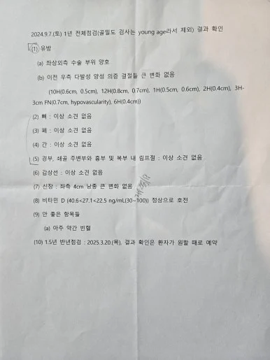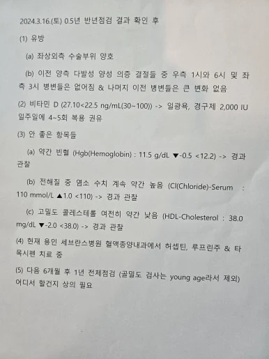 6개월 검사에서는 초음파를 통해 확인 결과 수술 전에 있던 섬유 선종이 4개가 없어졌다고 했다. 그리고 비타민 D가 초진 때부터 엄청 부족한 수치가 나와서 챙겨 먹으라고 하셔서 꾸준히 챙겨 먹었다. 수치가 조금 올랐다. LDL 콜레스테롤 수치도 아직은 안 좋게 나왔다.