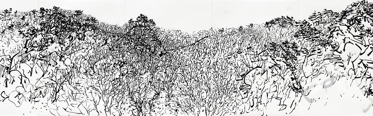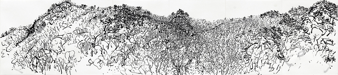 동양화첩을 처음 사용하여 그려보았다. 긴 능선을 그려내기 위해 선택한 것이지만 비싼 화첩을 망칠까 긴장되는 건 어쩔 수 없는 가난한 화가의 마음이다. 6시간을 쉬지 않고 그려 대강을 완성하였다. 얼마큼 길어질지 몰라 화첩의 한 중앙에서 시작하였더니 양쪽이 같은 길이로 남아버렸다.