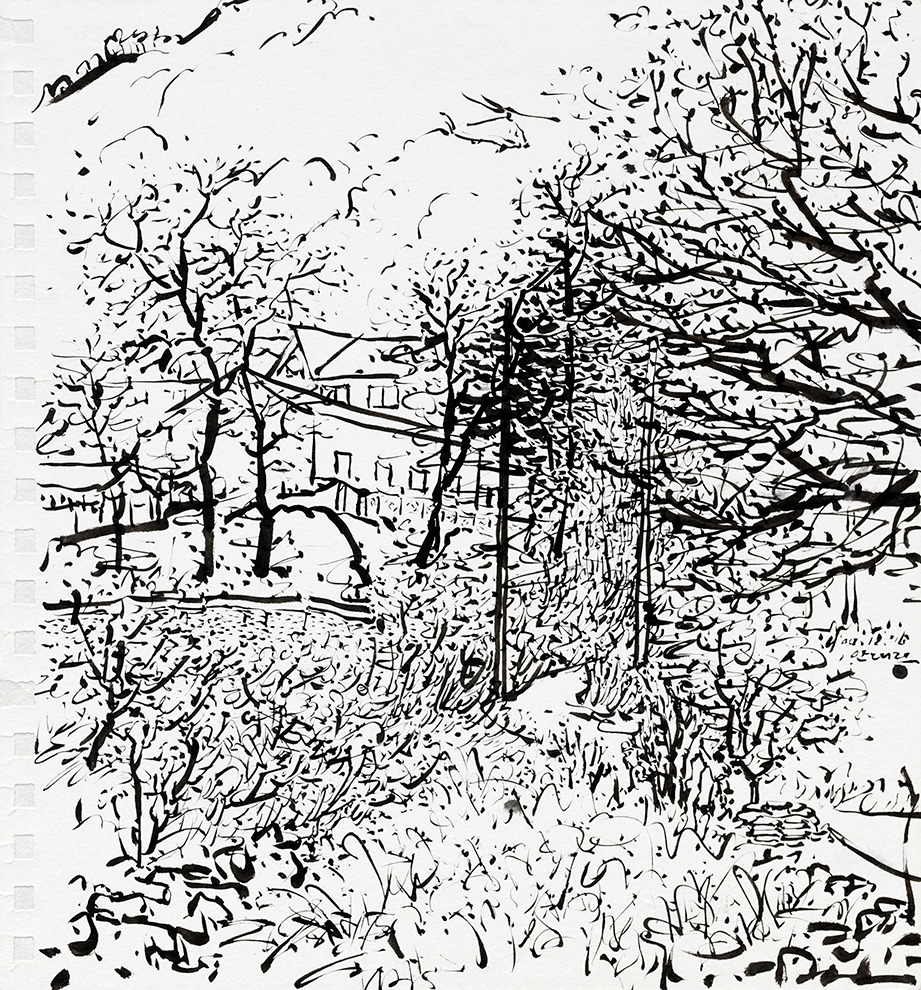 그리다 보니 빗방울이 떨어지며 바람이 세다. 우산을 어깨에 걸치고 그리는데 바람에 우산이 날아가 저 밑 개울에 빠져버렸다. 오골계를 키우시는 임병욱 할아버지께서 자신에게 인사를 드리다 그리된 거라 여기셨는지 슬리퍼 채로 바위를 타고 내려가시다 미끄러지셨다. 급히 잡아드리며 '다치신다 그저 두시라, 괜찮다' 하였는데 개울물 안으로 걸어 들어가 우산을 건져 올려주시고 걱정하는 내게 손을 휘저으시며 휘적휘적 걸어 들어가신다.