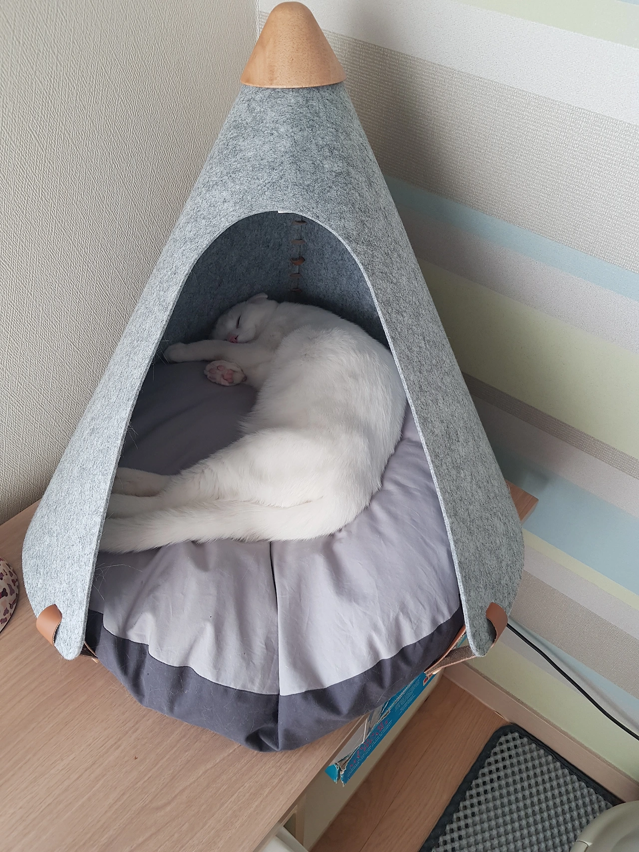 크림이는 세모 지붕이 있고 푹신한 방석이 놓인 침대에 올라가 우아하게 누워 집사들을 관찰하는 것 같았다.