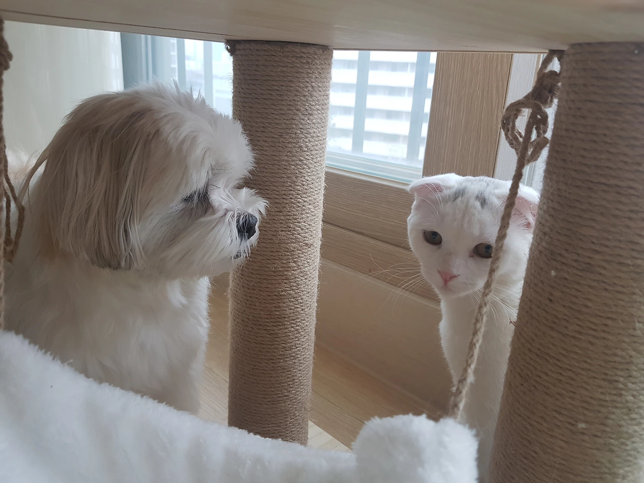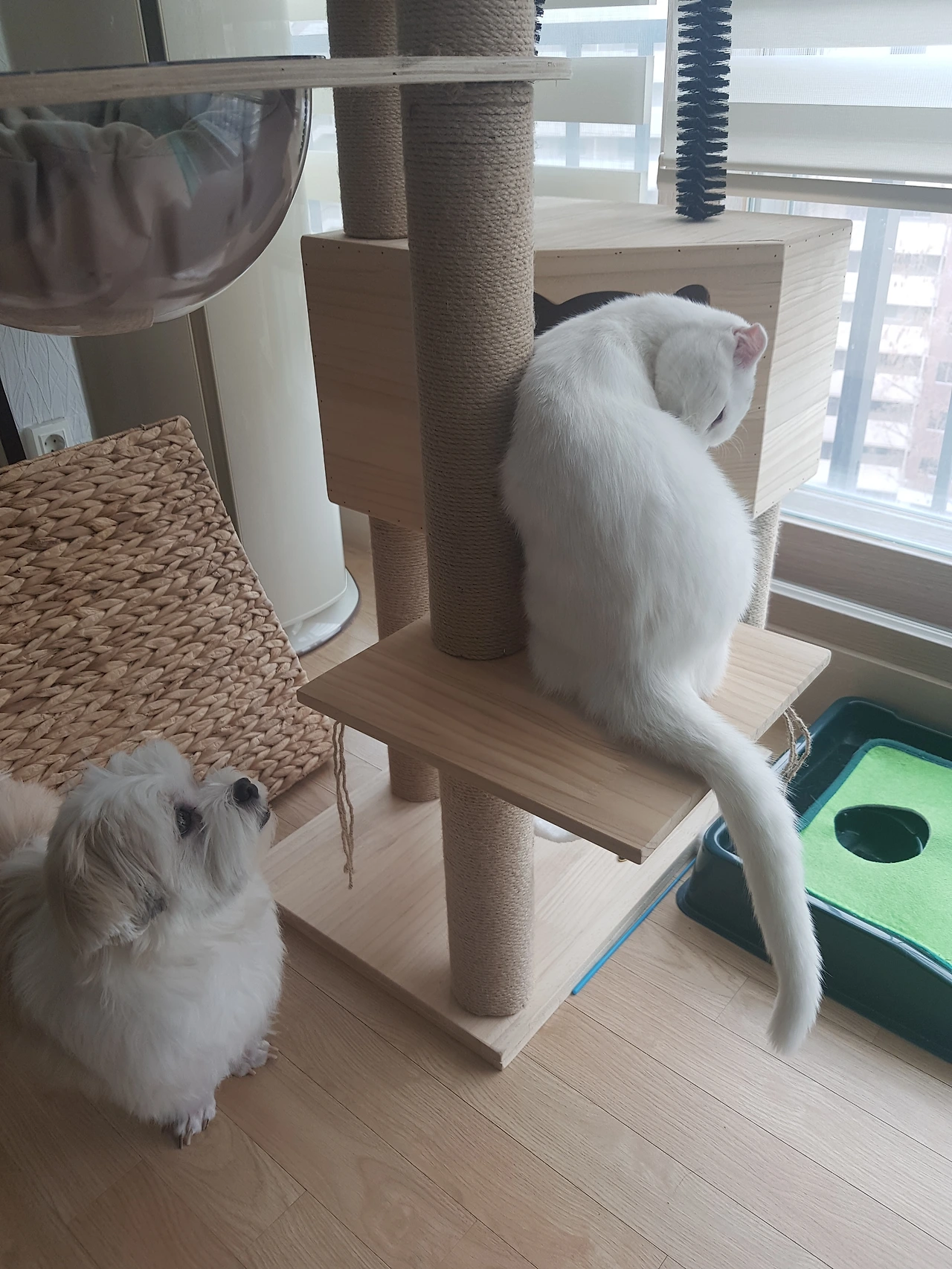 또 그 높은 캣타워도 타워까지 세 걸음에 뛰어오르는 크림이의 모습은 쿠키에겐 말 그대로 저 세상의 선녀같이 보였을 것이다.
