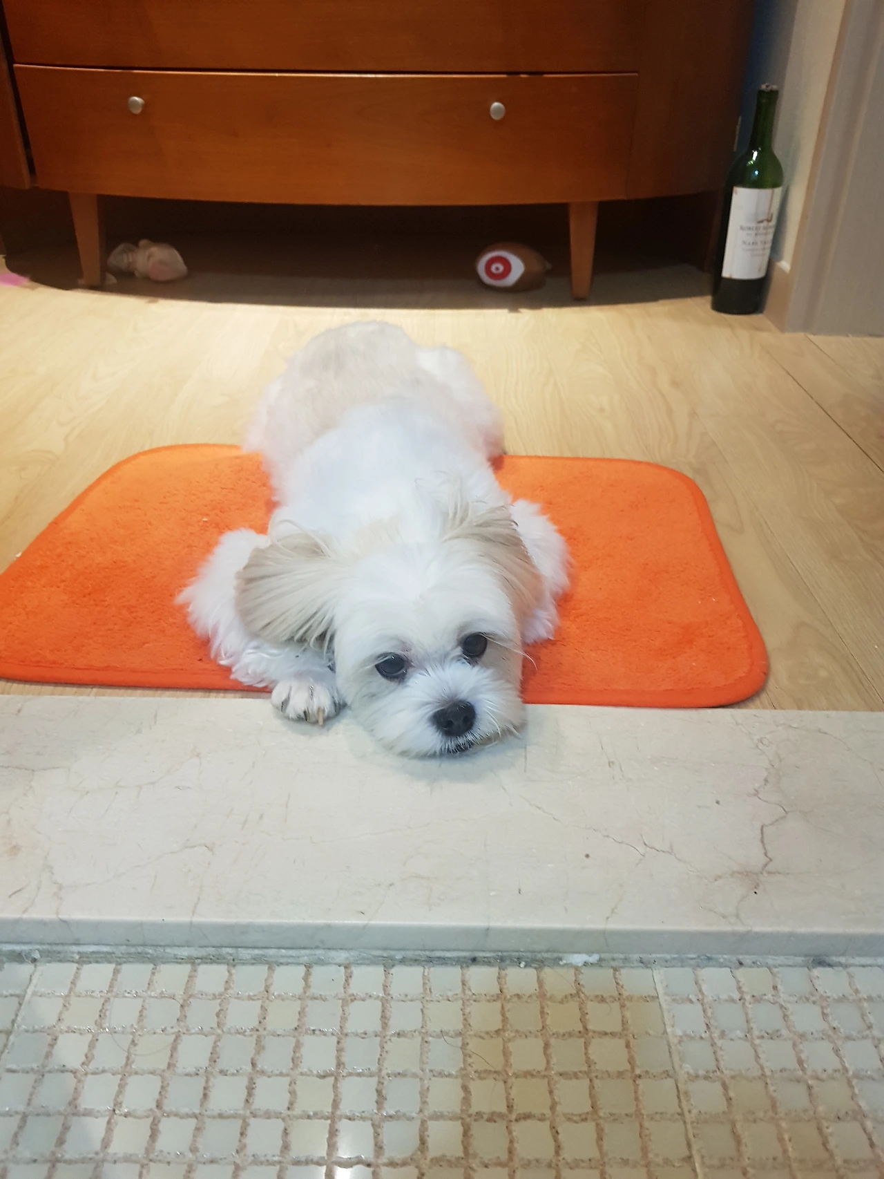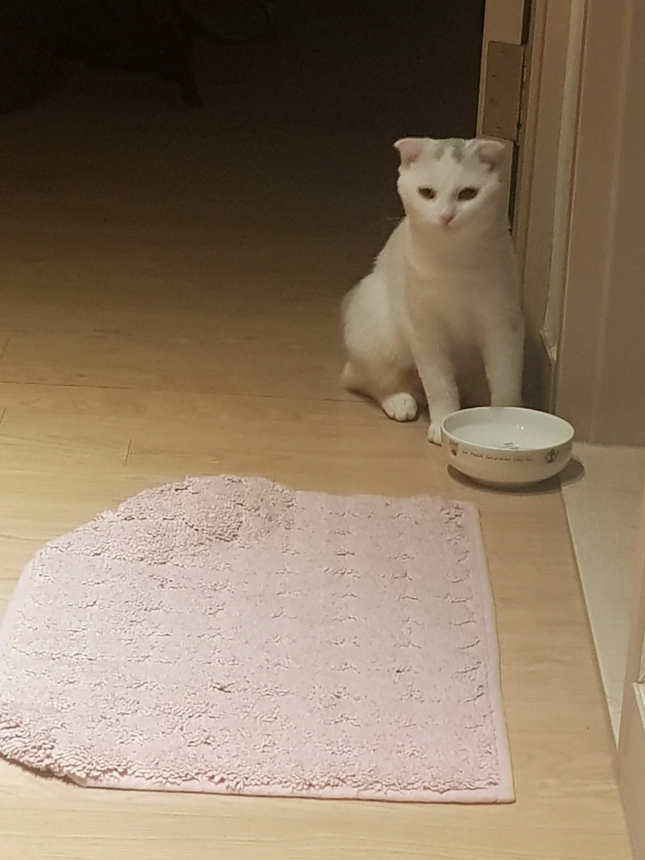 쿠키는 목이 마르면 화장실 근처에 앉아 그윽한 눈 맞춤으로 신호를 보내거나 아예 문턱에 엎드려 있다. 직수를 마시기는 어렵지만, 맑고신선한 물을 떠달라는 것이다.