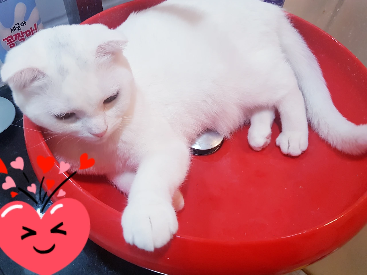 흐르는 물을 기다린걸까?느닷없이 세면대에 누워있는 크림이.