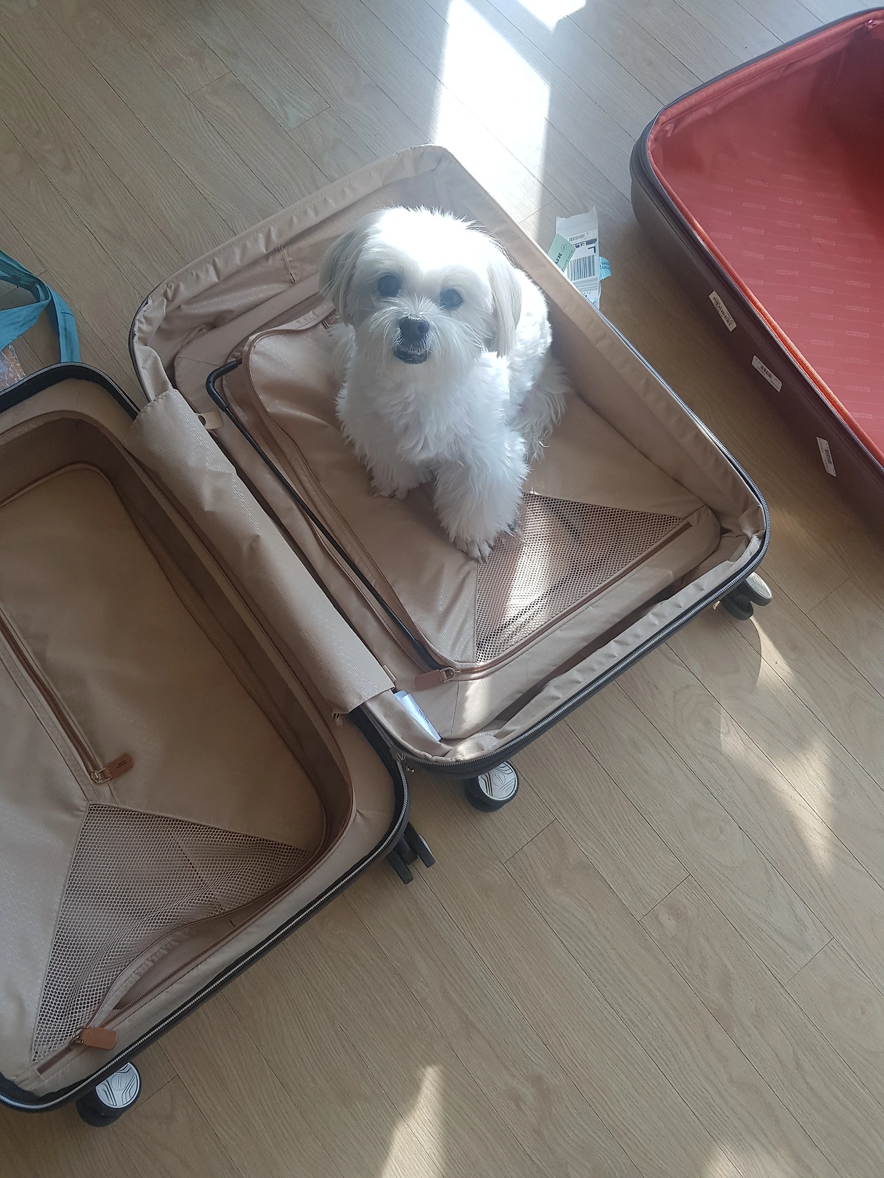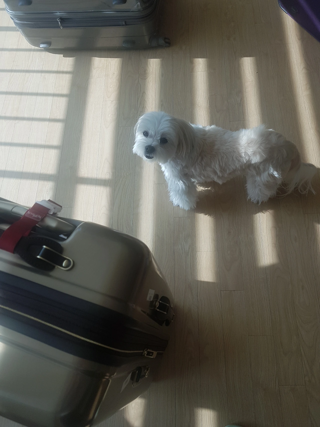 쿠키는 여행가방을 보면 꼬리가 내려가고 슬픈 표정이 된다. 가족들이 일 년에 두어 번은 여행 가느라 병원에서 운영 중인 애견호텔에 맡겨진 적이 종종 있었다.