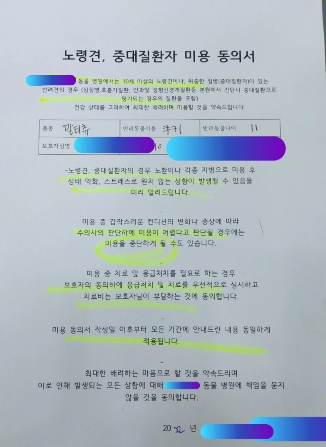 그리고 추석빔으로먼저 쿠키 미용을 해주기 위해 병원에 갔다. 그런데 갑자기 담당 실장님이 미용 전에 동의서를 작성해야 한다며 흰 종이를 내밀었다. 별생각 없이 받아 든 동의서 내용에 나는 우지직 갈비뼈에 금이 가는 것 같은 통증을 느꼈다.