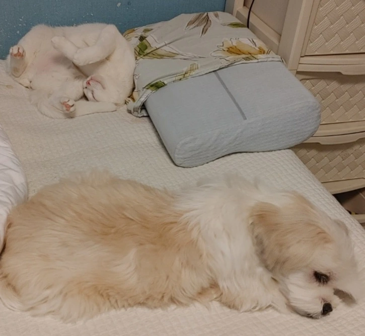 어느 날 새벽이었다. 잠을 깨면서 움직이다 보면 항상 내 발과 손에 동시에 만져지는 귀염둥이들의 보드라운 털. 발 밑엔 쿠키가, 왼쪽 손 닿는 거리엔 크림이가 자고 있다.