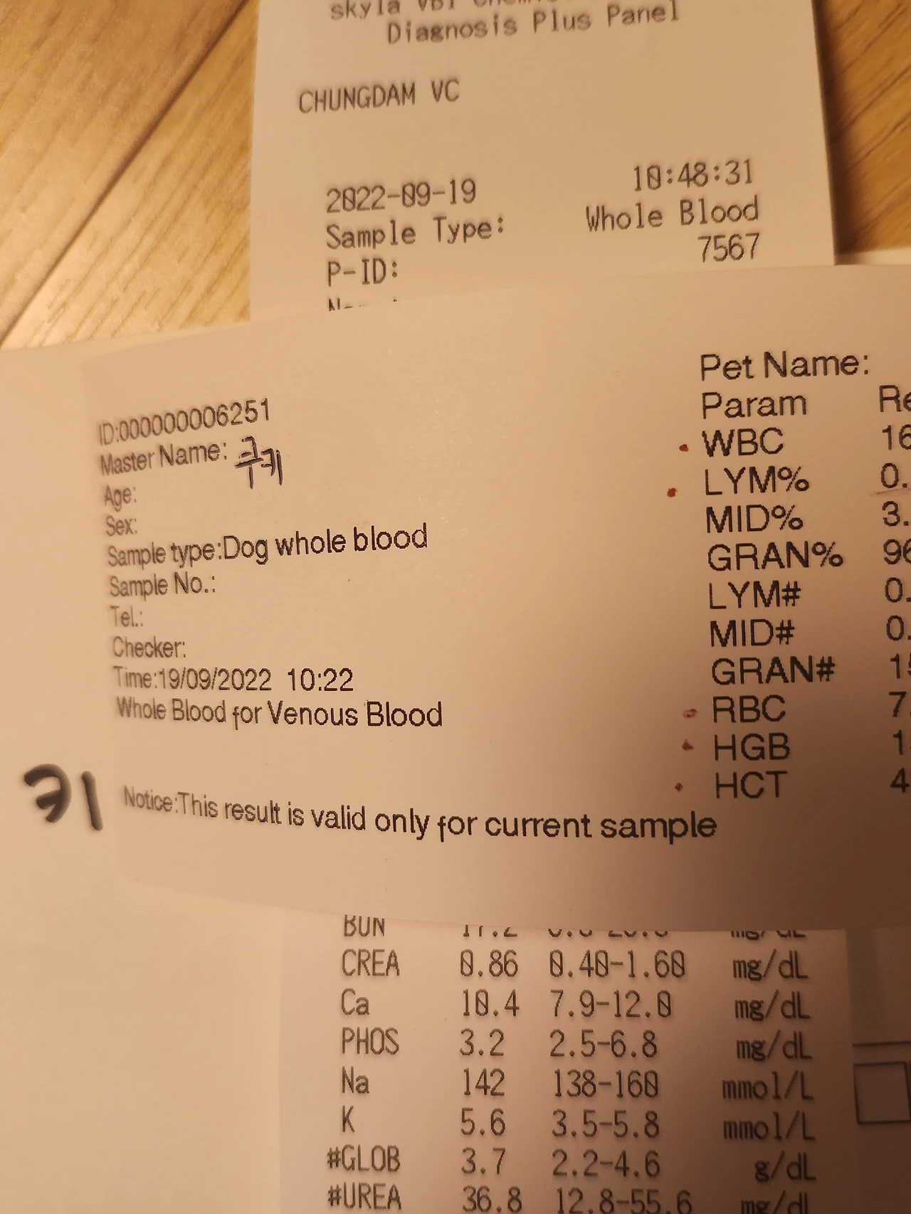 피를 뽑는데 예감이 좋지 않았다.. 서너 달을 간식 한번 안 주고 엄격하게 관리했지만 하늘도 무심하시지, 저번보다는 떨어졌지만 여전히 높은 간수치가 나왔다. 선생님은 이제 간약을 먹이자고 하셨다. 뿐만 아니라 면역을 담당하는 림프 세포도 정상 이하라 아토피 같은 피부병이 배와 손발톱 귀까지 퍼져있다고 했다. 원체 면역력이 낮아졌다는 것이다. 작년 봄까지 양호했는데...