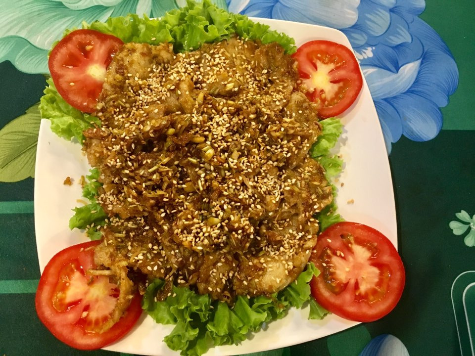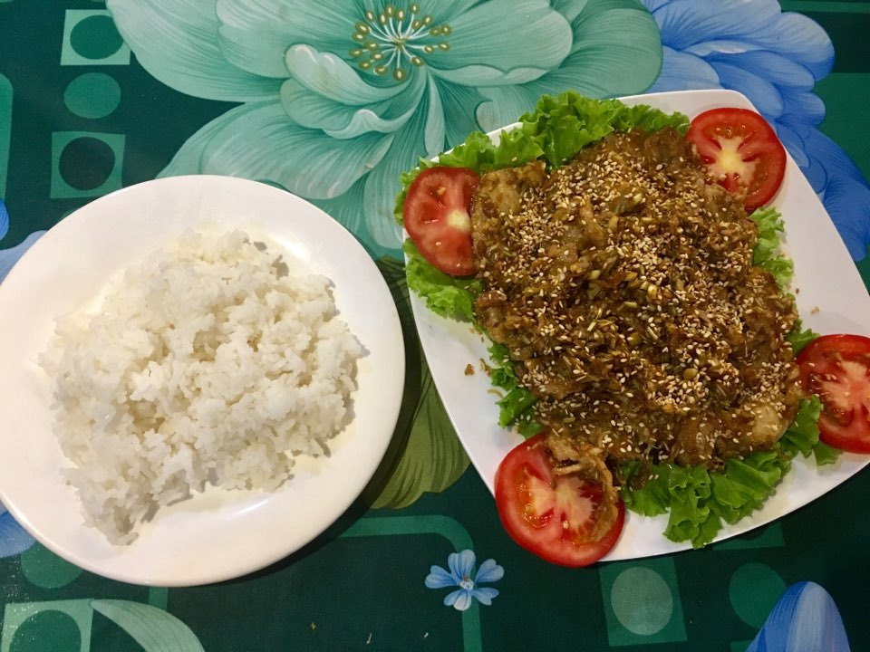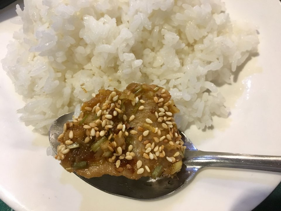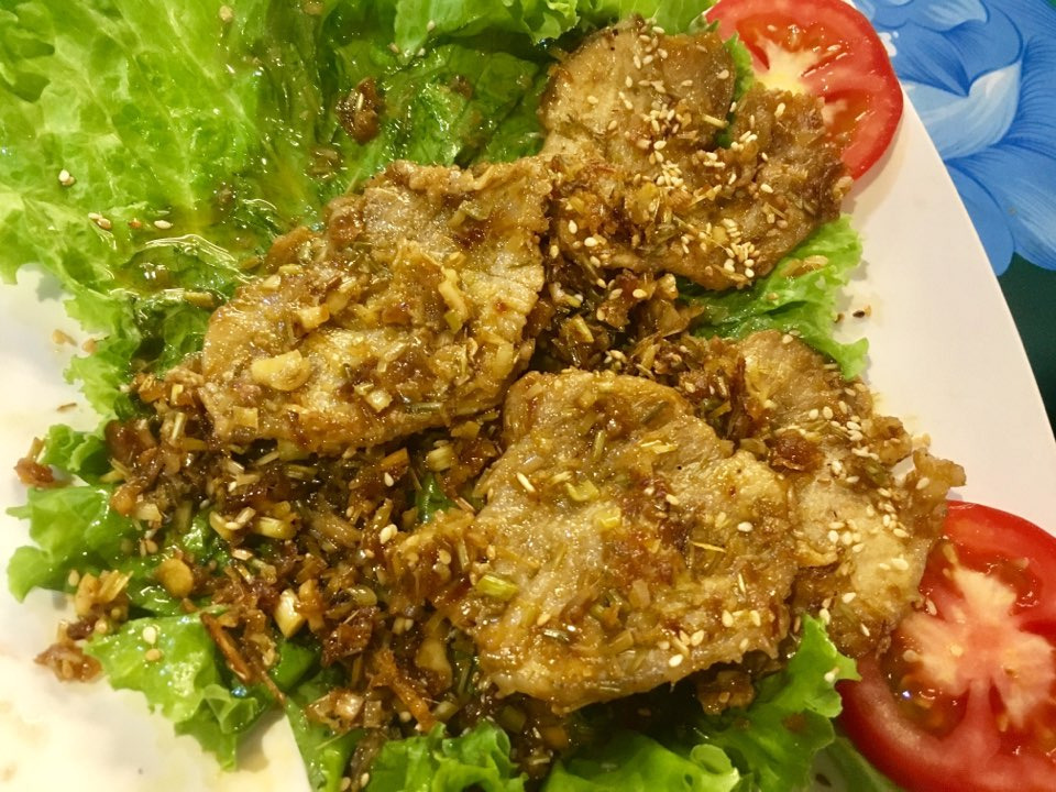 우리 나라 불백같은 불향 살짝 나는 돼지고기에 깨와 달콤 짭조롬한 맛이 어우러진 음식이다.
