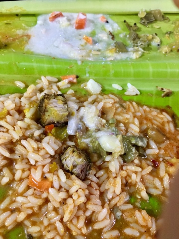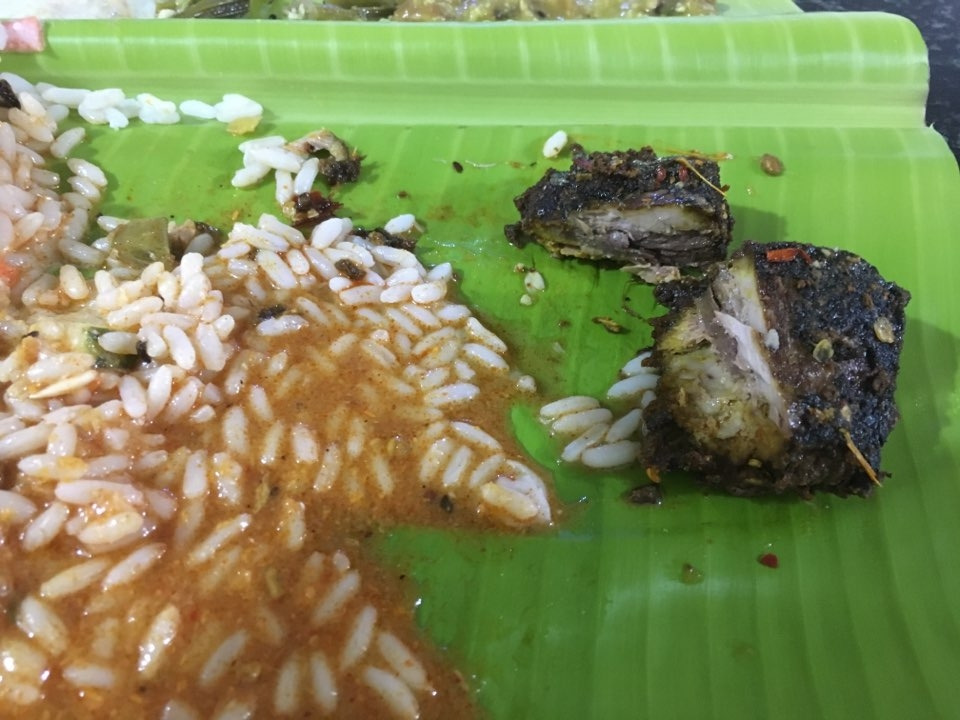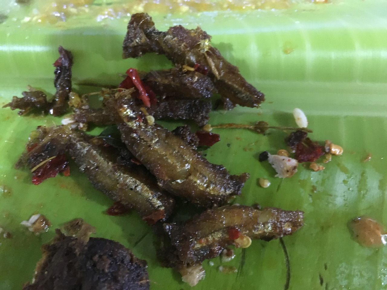 한참 밀즈를 혼자서 감탄하며 먹고 있을 때쯤, 그 청년이 갑자기 무언가를 나의 바나나 잎 위에 얹기 시작함다. 무엇인지 자세히 보니, 아주 작은 생선으로 만들어진 반찬 같은 것이었다. 약간 검은색에 가까운 색으로 인해 보는 순간 입맛이 쉽게 돋워 지는 그런 외관은 결코 아니었다.