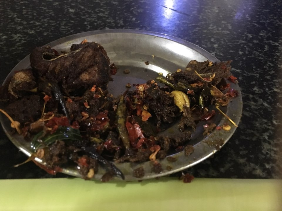 이내 그들은 나의 바나나 잎 위쪽에 두 세 덩이의 참치 조각을 함께 조리된 아주 칼칼하고 매콤해 보이는 빨간색 큼직한 건고추들과 담아 주었다. 맛보기 전에는 전혀 맛을 추측할 수 없는 외관이었다. 무언가 건조한, 매우 드라이한 요리였다.