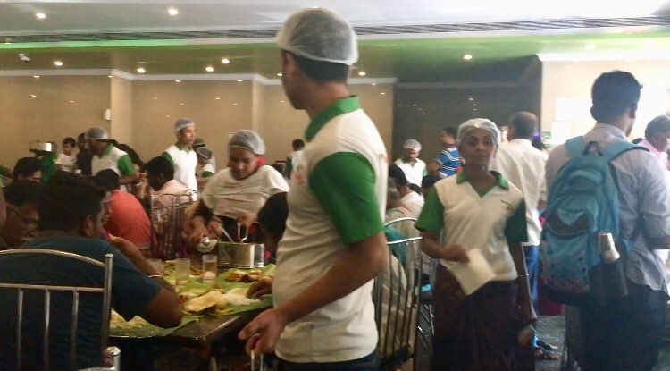 2, 300명은 족히 앉아 있을 거대한 식당의 실내에 들어 서니 갑자기 뭘 어떻게 해야 할 지 멍해진다. 싹싹하고 유쾌한 종업원들이 나를 편한 자리로 안내해 준다. 앉아 있자니, 바로 싱싱한 바나나잎을 한 켠에 가득 들고 있는 아저씨가 내 앞에 바나나잎을 깔아 준다. 그 이후로 나는 앉아 있기만 할 뿐, 모든 것이 그들의 질서대로 착착 진행된다. 더없이 유쾌하고 밝은 이 곳 아가씨가 사이드 반찬(서브지)들이 담긴 스뎅을 가져 와서 하나하나 바나나 잎위에 올려 준다.