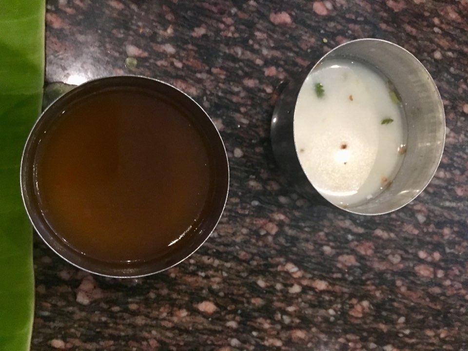 와다를 한 입 베어 무니, 안에는 아주 고운 입자의 브라운 렌틸콩의 맛이 살짝 느껴진다. 겉은 바삭하며 약간 거친 입자의 느낌이 나서, 와다의 튀겨진 겉면과 나름 촉촉한 속의 질감의 대조가 매우 맛깔스럽게 느껴진다. 신기한 것은 분명 튀긴 음식인데도 아침 식사로 먹기에 전혀 부담스럽지 않고 오히려 더 고소해서 손이 계속 간다는 사실! 이들리와 달리 와다 하나만 먹을 수 있을 만큼 이미 간이 잘 베어들고 재료가 채워진 음식이라 손이 가는 걸 멈출 수가 없다. :)