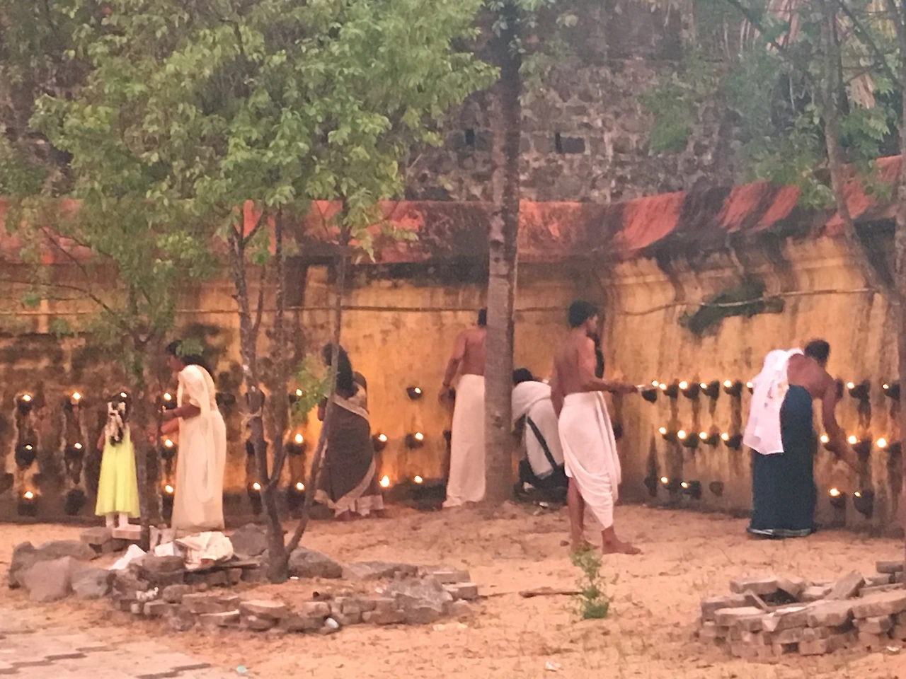 사람들은 가장 곱디 곱고 정갈한 옷으로 차려 입고 저녁 의식을 올리러 이 곳으로 발걸음을 옮기고 있는 중이었다. 여자는 사리를, 남자는 이 곳 도띠를 입고 사원의 벽에 초를 하나하나 켜는 모습이 얼마나 정성스럽고 진지하던지, 그 아름다운 모습을 한참을 멀리서 바라 보았다.
