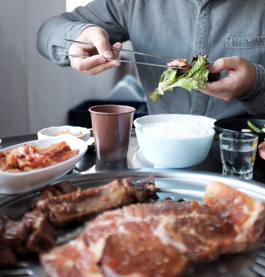 여러 종류의 넓은 모양의 맛있는 채소 한 두개를 집어서 우리의 손바닥 위에 얹는다. 그리고 고기든 무엇이든 주재료를 직접 한 두 점, 혹은 원하는 만큼 얹어 나만의 한 입 요리를 만들고 쌈장이든 청양고추든 마늘이든 좋아하는 취향대로 쌈 안에 들어갈 음식을 정하고 조합한다. 그렇게 나의 입맛에 맞는 나만의 음식을 그 자리에서 매번 조리해서 먹는다는 그 즐거움! 처음에는 손바닥을 중심으로 펼쳐져 있던 손은 이내 마지막에 한 입에 쏙 넣을 수 있도록 손 끝을 한 데 오므리면서 모든 손가락을 모으게 된다.