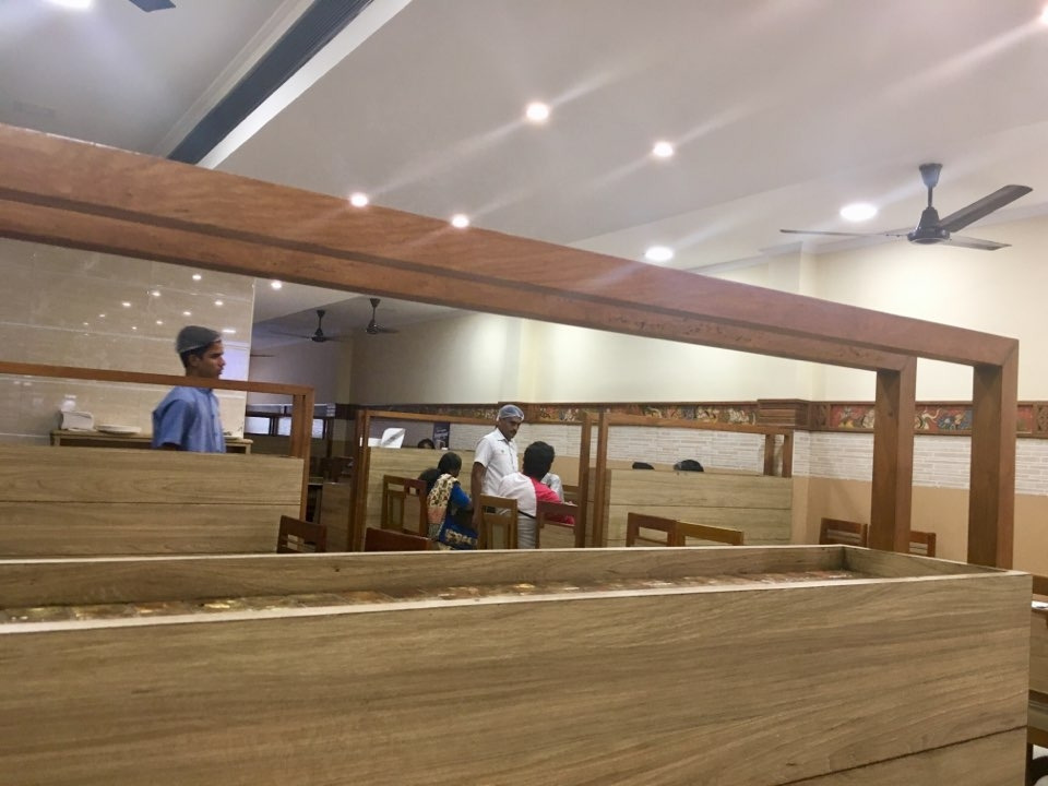명성이 자자한 곳이기에 그저 허름한 차림으로 혼자 들어서는 여행자를 홀대하면 어쩌나 하는 생각에 공간을 이리저리 둘러 보며 들어 섰다. 그런데 담당자가 너무 따스하게 나를 맞아 주며 우선 비어 있는 자리로 안내해 준다. 역시 따스하고 친절한 남인도 사람들이란! :) 사실 이렇게 혼자일 때면 여러 명이 함께 앉을 수 있는 크고 둥그런 테이블 보다 일렬로 쭉 앉을 수 있는 테이블 쪽으로 안내해 주는 것이 훨씬 마음이 편하다. 이 유명한 집의 영업에 직접적인 영향을 미치고 싶은 마음은 전혀 없기에!