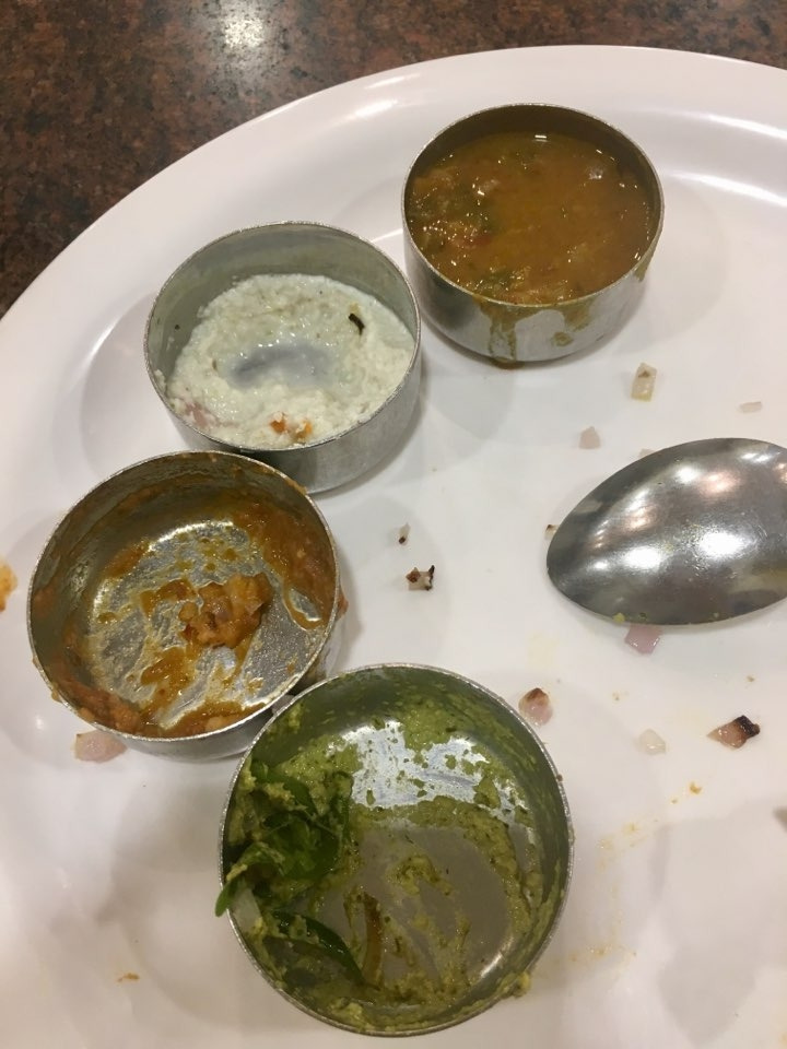우리의 급식 식판 같은 곳에 얇고 바삭바삭하게 맛있게 구워진 나의 첫 도사가 맛깔스러워 보이는 사이드 처트니들, 삼발과 함께 나왔다. 일단 도사를 한 번 쓱 보고 난 후, 가장 바삭하게 맛있고 노릇노릇하게 구워진 가장자리를 살짝 손으로 가볍게 뜯어 내어 본다. 그렇게 가장 궁금한 코코넛 처트니로 쏘옥! 한 입 넣는데 코코넛의 고소함과 깔끔한 맛이 입 안 가득 퍼진다. 바삭한 도사와 코코넛 처트니가 어우러진 맛은 정말 맛보지 않으면 설명하기가 어렵다. 고소하고 건강한 맛이 감돌아서 감탄하며 혼자 실룩실룩 웃는다. 내가 남인도에 정말, 진짜로 돌아 오긴 했구나 하는 느낌이었다.