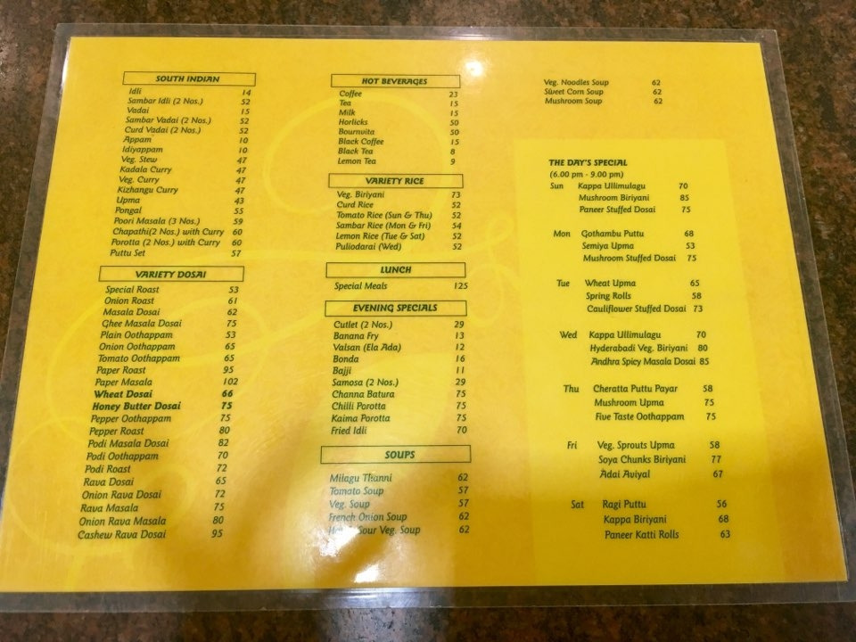 이 곳의 특징적인 점은 까카 이라치(Kakka Irachi). 아주 작은 홍합을 코코넛과 함께 볶아낸 요리다. 사실 기본 반찬으로 나오기에는 꽤 귀한 요리이며, 다른 곳에서는 따로 시켜야 하는 요리이지만 이 곳은 까카 이라치를 여느 밀즈의 메뉴처럼 무한으로 리필해 준다. 로컬 사람들이 이 부분을 사랑하는 듯!