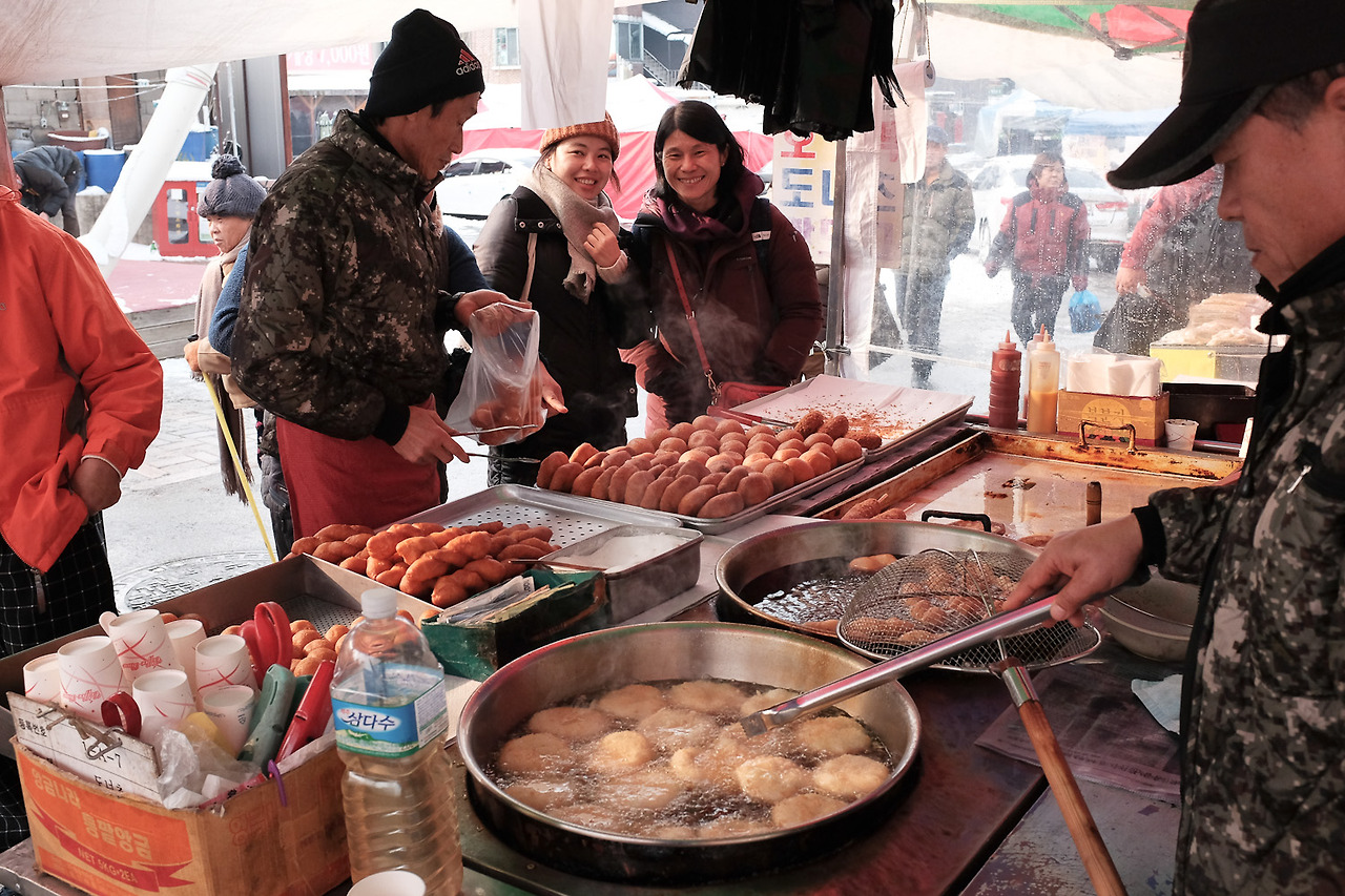 당연히 길거리 음식도 준비 완료! 세계 어디에서 왔더라도 남녀노소 불문하고 사랑에 빠지고 말 길거리 음식인 마성의 호떡까지 야심 차게 준비했다. 당연히 그냥 호떡이 아니다. 까다로운 입맛을 행복하게 해 줄 사랑하는 할머니 호떡집이 오일장 안에 있다. 이 곳의 호떡만큼 맛있는 호떡을 먹어본 적이 없다. 견과류를 아낌없이 듬뿍 넣고 노릇노릇 가장 맛있게 구워졌을 때 비로소 건네주시는 엄격함에서 장인정신마저 느껴지는 할머니의 호떡집.