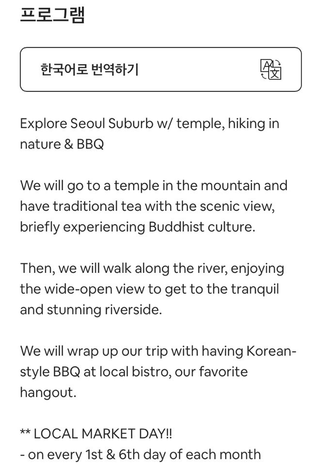 트립의 상세 페이지를 작성한 후 트립 승인을 받는 건 심리적으로 느끼기에 다섯 개 정도의 허들을 통과하는 것 같은 큰일이었다. 초기의 마켓 컬리 같다고 해야 할까? 가장 엄선된 트립만이 승인을 받은 것 같았다. 이때까지만 해도 에어비앤비는 사진 트립, 음식 트립과 같이 한 분야에 뾰족한 전문가가 자신의 분야를 활용하는 프로그램을 만들기를 권했다.