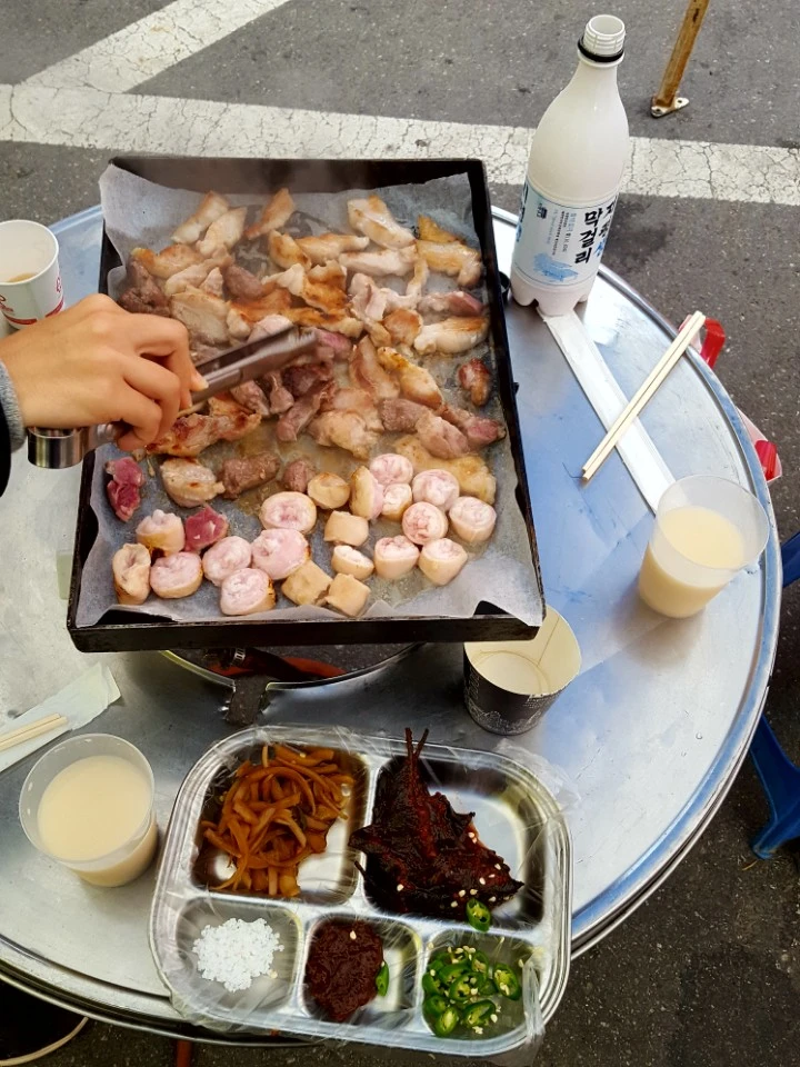 오일장의 야외 공간 한복판에 있는 둥그런 스뎅 테이블에 앉아 불판을 앞에 두고 고기를 구워 먹는 곳이다. 이마저도 충분히 매력적인데, 이 시장 고깃집의 진정한 매력은 단연 친근하고 사람 좋은 주인아저씨라는 사실! 자리에 앉으면 아저씨가 몇십 년은 족히 되었을 옛날 가위로 고기를 숭덩숭덩 잘라서 구워 주신다.