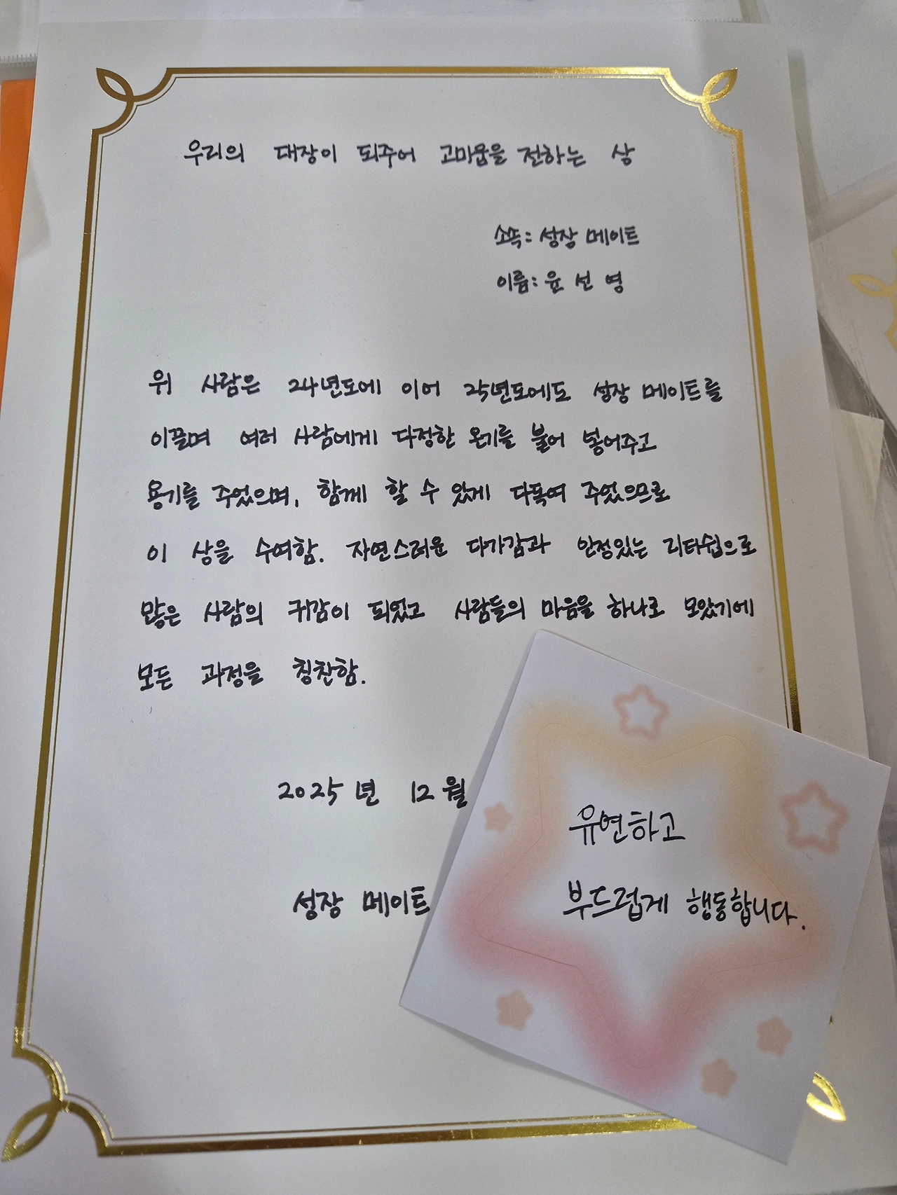 한 해 동안 일하면서 챙겨주셨던 분들, 성장할 수 있도록 기회를 주신 분들, 응원해 주신 분들, 내편이 되어주신 분들께 감사의 인사를 전하며 25년을 마무리하는 나만의 의식을 진행했다. 참 고맙고 감사한 일들이 많았고 좋은 분들과 함께 보낼 수 있어서 감사한 한 해였다.