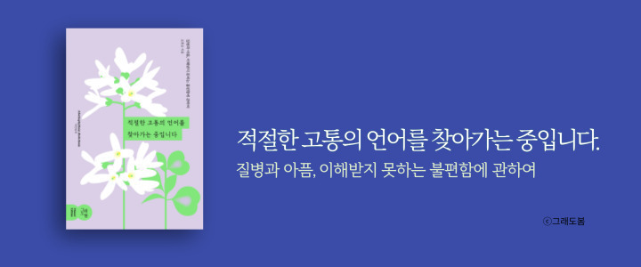 관절염은 누구나 아는 병이었다. 내가 고관절에 이상이 있다고 하면 노년기에 많이들 겪는 증상이니까 ‘삭신이 쑤신다’는 흔한 표현 하나로 내 상태를 충분히 설명할 수 있었다. 사람들은 아주 자세히 알지는 못해도 대충 어떤 증상을 겪을지 짐작했다. 잘알려진 병이기에 말하기 어렵지 않았고, 주변에서 충분히 이해했으며, 비교적 젊은 나이에 겪게 되었다고 동정의 시선을 보내기도 했다. 흔한 병을 앓으면 그런 자연스러운 공감대 속으로 녹아들 수 있다.