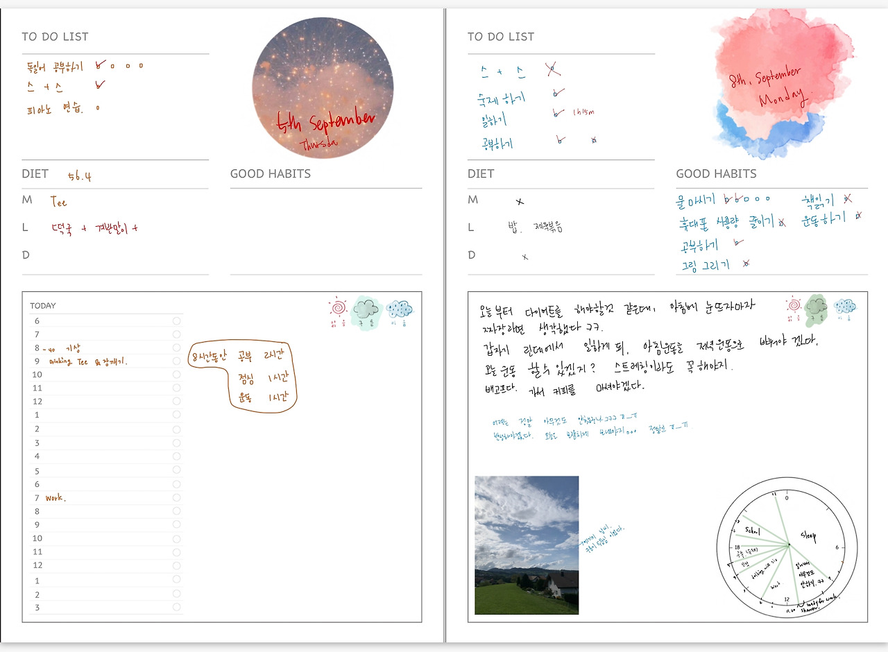 용지를 가로로 변경하고 한 장에 이틀 분량 쓰기. 이 레이아웃도 괜찮긴 했는데 그래도 많이 남는 부분이 싫었다.