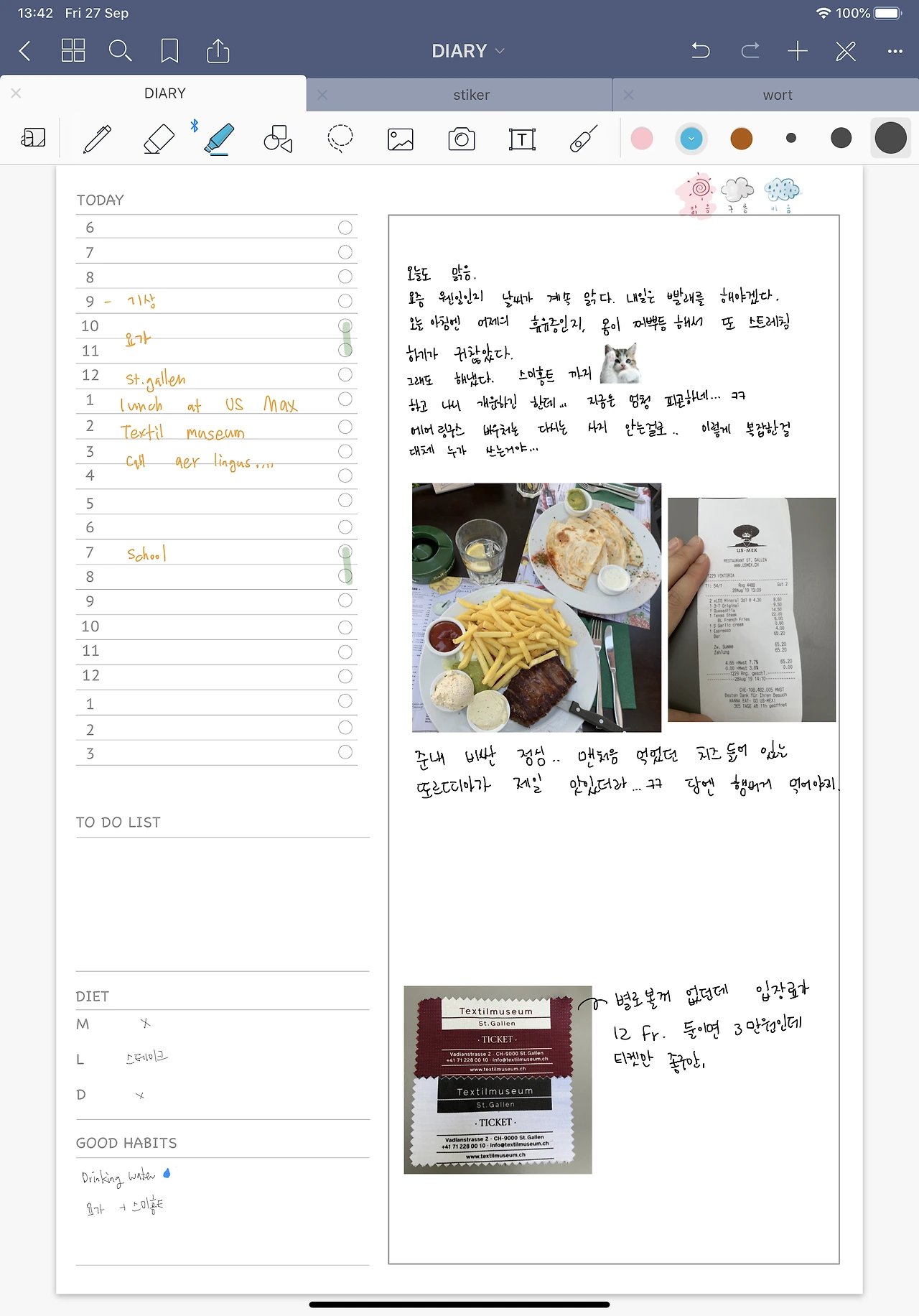 아이패드로 무엇을 할 거냐고, 그리고 나는 대답했다. 다이어리도 쓰고, 공부도 하고 다이어리도 쓸 거라고 ㅋㅋㅋㅋ