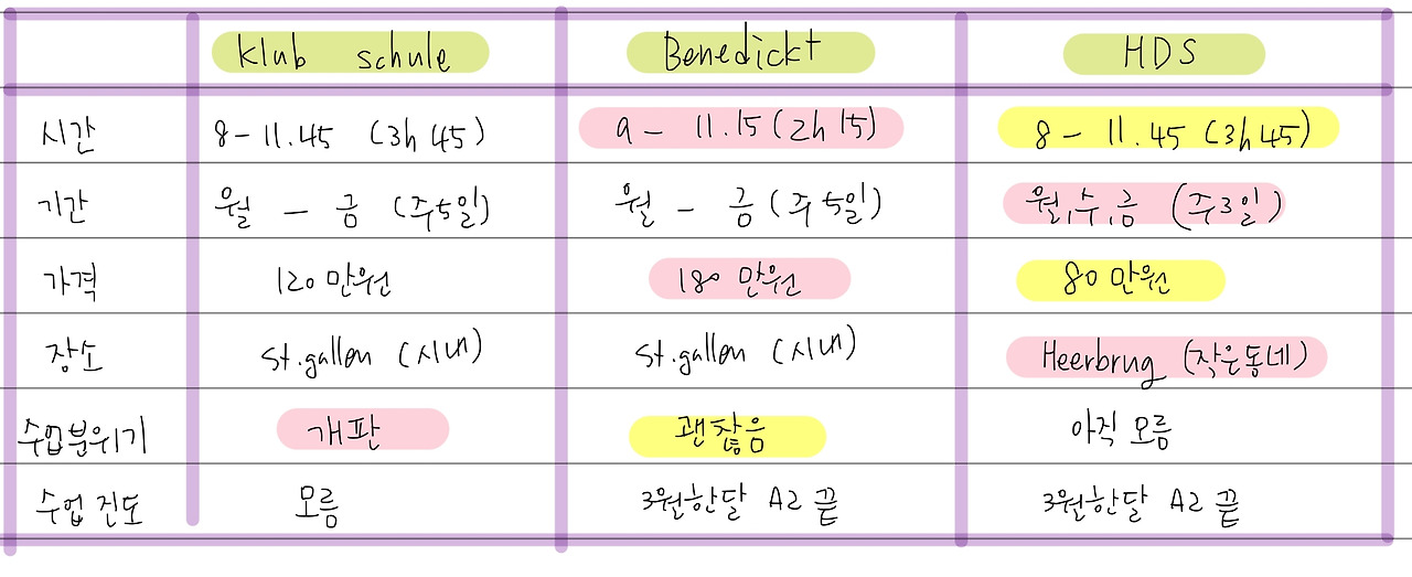 내가 있는 곳에 큰 도시 생갈렌(st.gallen)에는 유학원이 4군데가 있는데 스위스에서 내에서 유명한 클룹 슐레 klub schule, 베네딕트 benedickt, 아이다 aida, 그리고 하데에스 hds 이렇게 총 4곳이다.