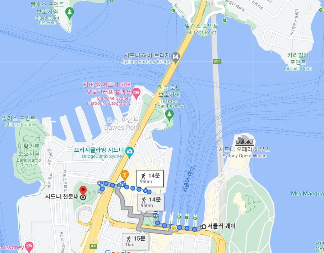 페리에서 내려, 언덕길을 따라 약 15분쯤 걸어가면 시드니 천문대에 갈 수 있는데, 가는 길에 하버브릿지를 들를수 있다.