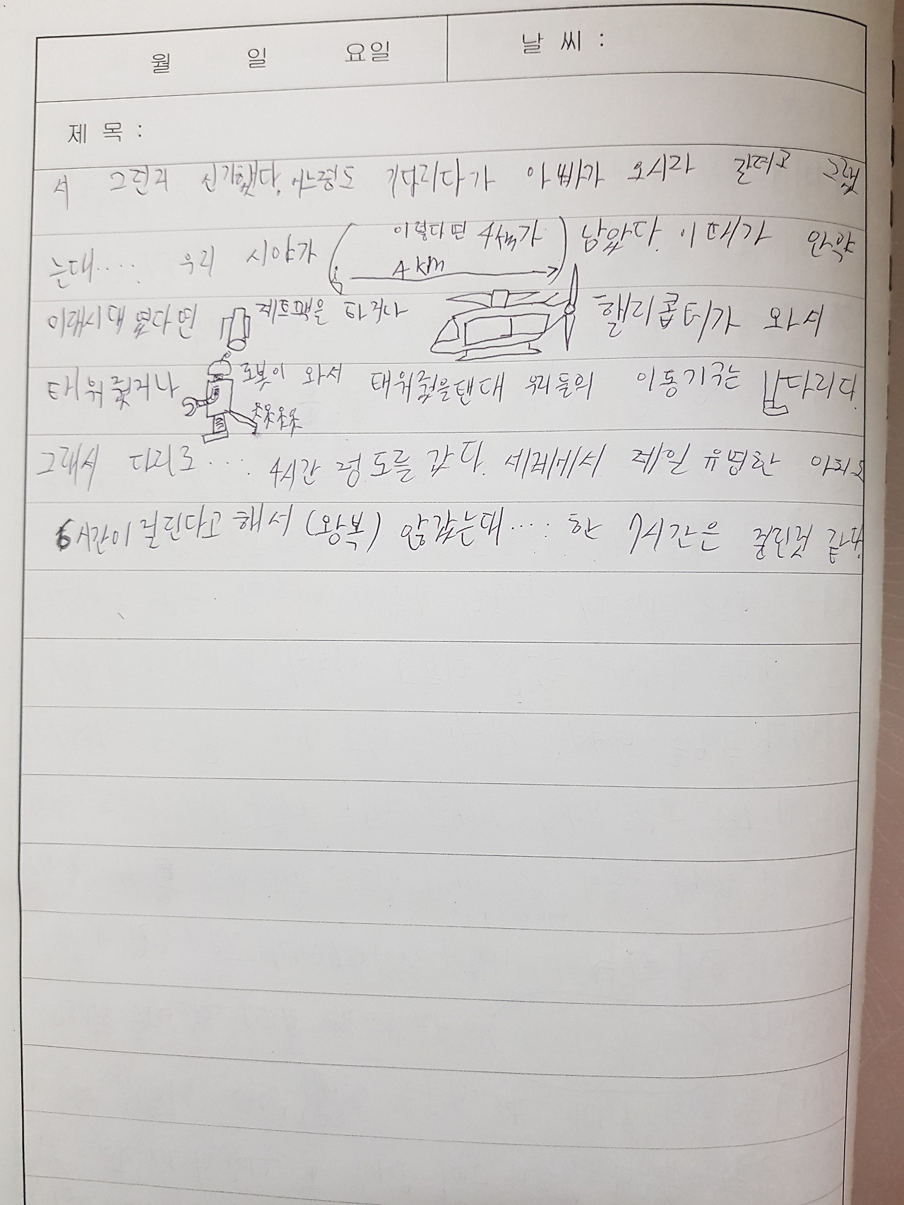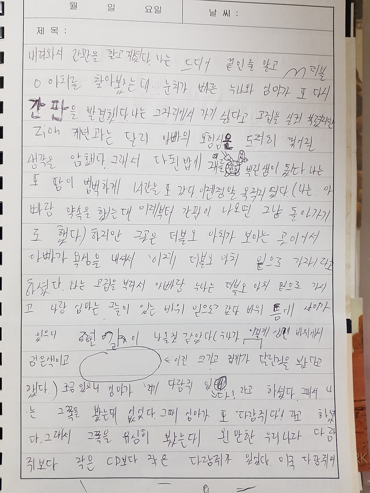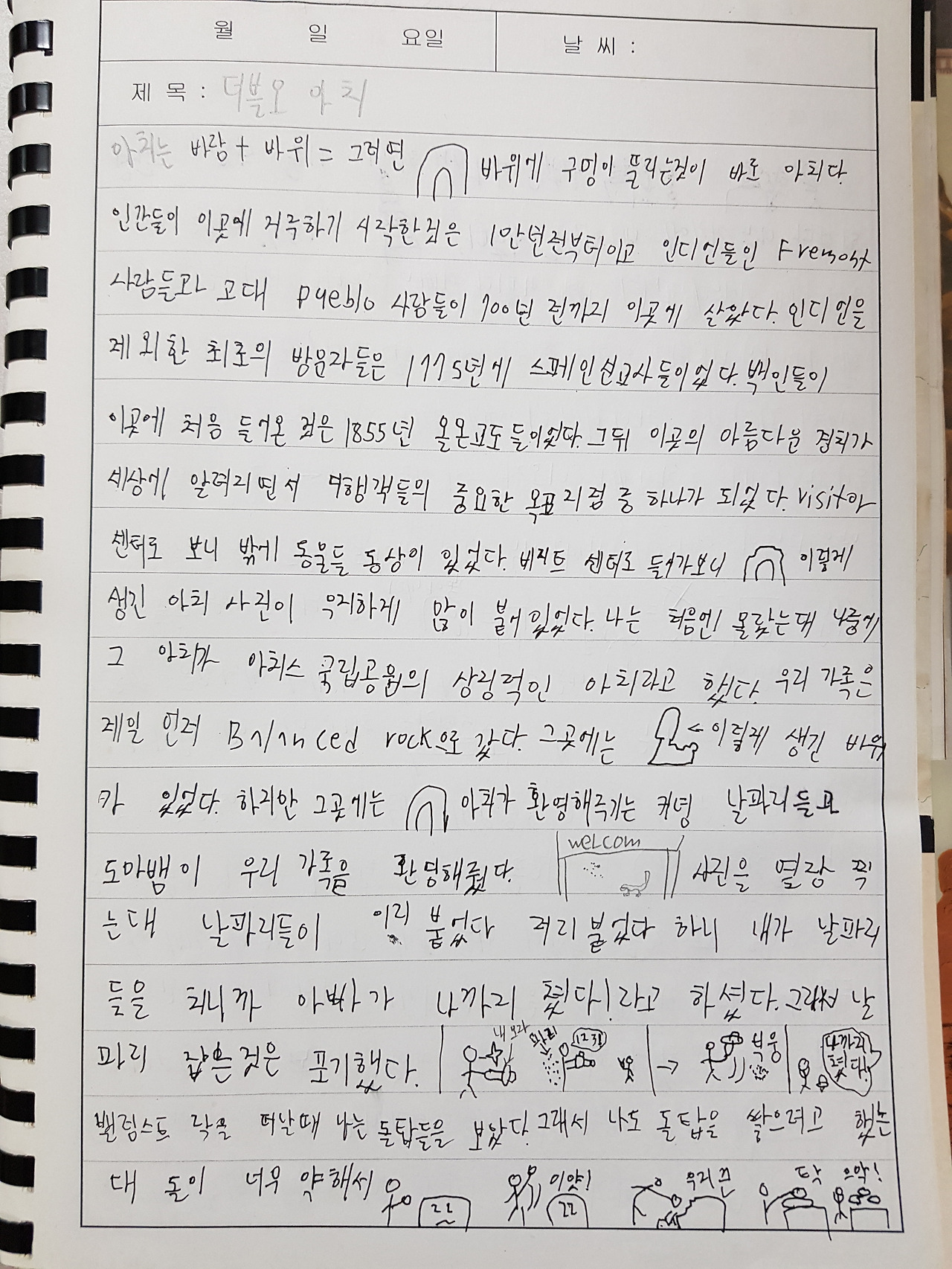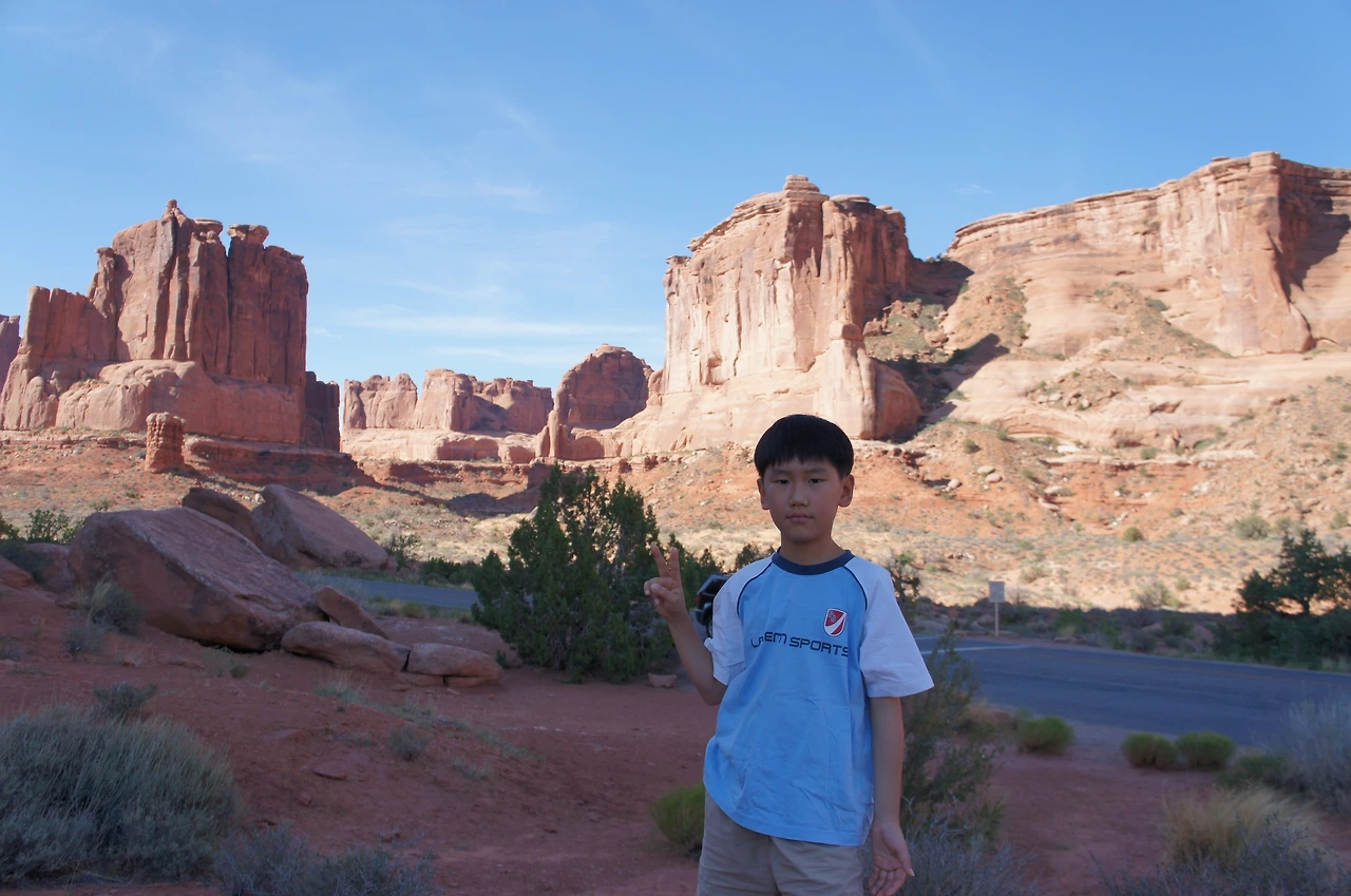나는 고집을 부려서 아빠랑 누나는 더블오 아치 밑으로 가시고 나랑 엄마는 그늘이 있는 바위 밑으로 갔다. 바위틈에 사이가 있으니 전갈이 나올 것 같았다 (누나가 이렇게 생긴 바위에서 검은색이고 이런 크기고 집게가 달린 것을 봤다고 했다) 조금 있으니 엄마가 저기 다람쥐가 있다!라고 하셨다. 그래서 나는 그쪽을 봤는데 없었다. 그때 엄마가 또 다람쥐다!라고 하셨다. 그래서 그쪽을 봤는데 웬만한 우리나라 다람쥐보다 작은 CD보다 작은 다람쥐가 있었다. 미국 다람쥐여서 그런지 신기했다. 어느 정도 기다리다가 아빠가 오시자 갈려고 그랬는데... 우리 시야가 4km가 남았다. 미래시대였다면 제트팩을 타거나 헬리콥터가 와서 태워줬거나 로봇이 와서 태워줬을 텐데 우리들의 이동기구는 다리다. 그래서 다리로... 4시간 정도를 갔다. 세계에서 제일 유명한 아치도 6시간이 걸린대서 안 갔는데... 한 7시간은 걸린 것 같다.