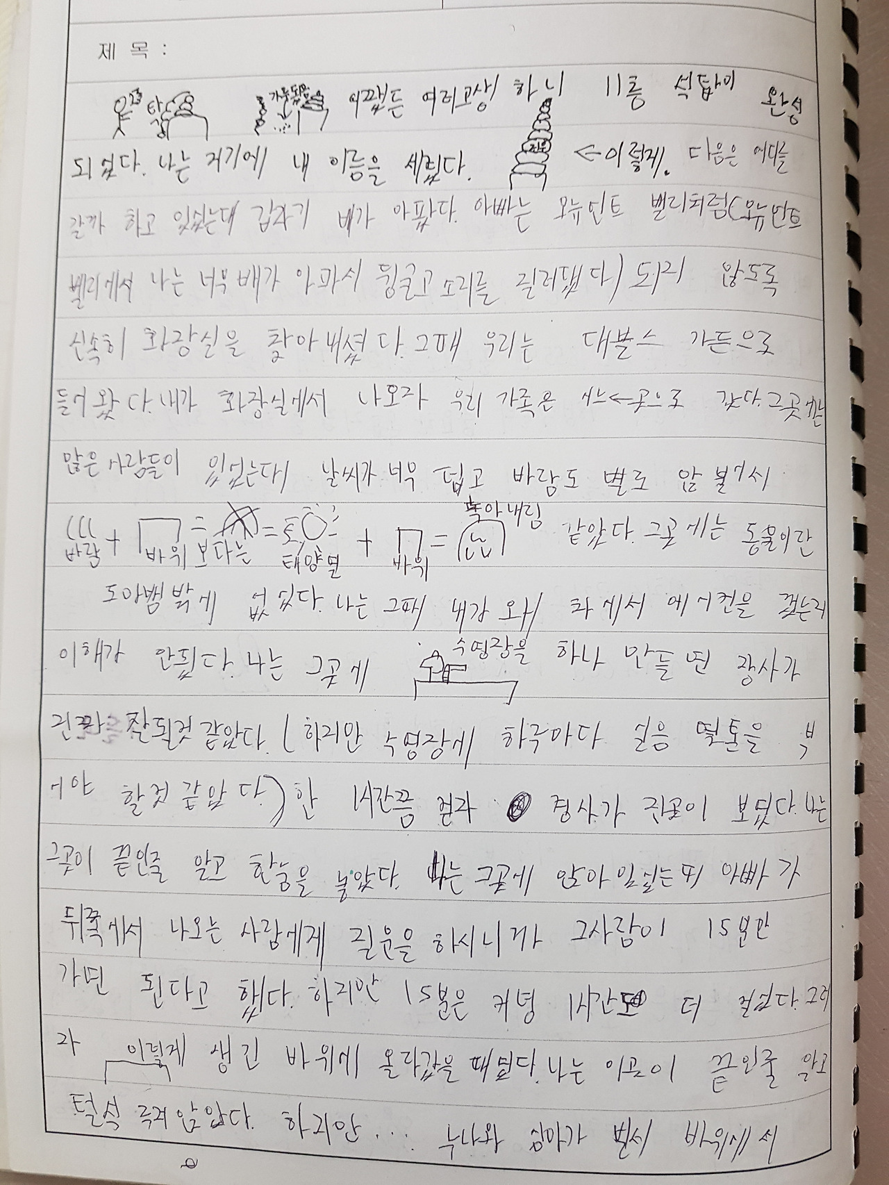 Visitor센터로 보니 밖에 동물들 동상이 있었다. 비지트 센터로 들어가 보니 이렇게 생긴 아치 사진이 무지하게 많이 붙어있었다. 나는 처음엔 몰랐는데 나중에 그 아치가 아치스 국립공원의 상징적인 아치라고 했다. 우리 가족은 제일 먼저 Balanced rock으로 갔다. 그곳에는 이렇게 생긴 바위가 있었다. 하지만 그곳에는 아치가 환영해주기는 커녕 날파리들과 도마뱀이 우리 가족을 환영해줬다. 사진을 몇 장 찍는데 날파리들이 이리 붙었다 저리 붙었다 하니 내가 날파리들을 치니까 아빠가 나까지 쳤다!라고 하셨다. 그래서 날파리 잡는 것을 포기했다. 밸런스드 락을 떠날 때 나는 돌탑들을 보았다. 그래서 나도 돌탑을 쌓으려고 했는데 돌이 너무 약해서. 어쨌든 여러 고생하니 11층 석탑이 완성되었다. 나는 거기에 내 이름을 새겼다.