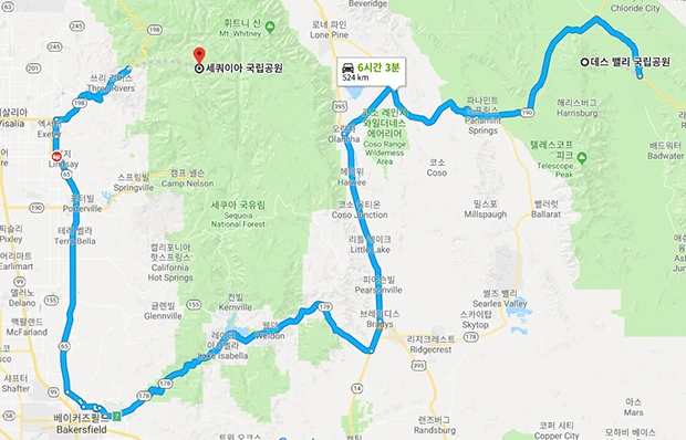 다음 목적지는 세계에서 가장 크고 오래된 나무들이 사는 세쿼이아 국립공원이다. 데스밸리에서 세쿼이아 국립공원까지 직선거리는 170km 정도인데 길게 뻗은 시에라 네바다 (Sierra Nevada) 산맥이 가로막고 있어, 산맥 끝으로 돌아가야 한다. 덕분에 총 운전 거리는 524km, 적어도 6시간은 달려야 한다.