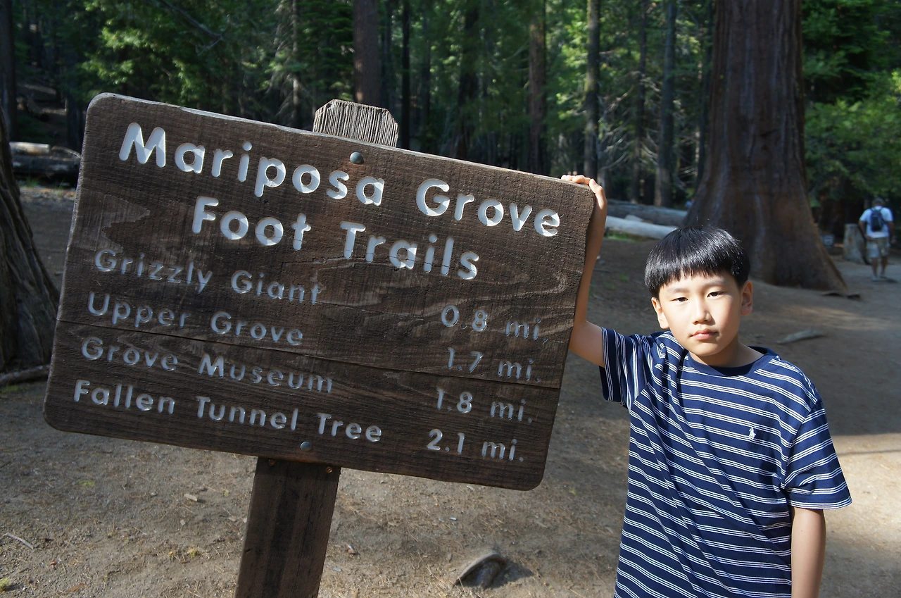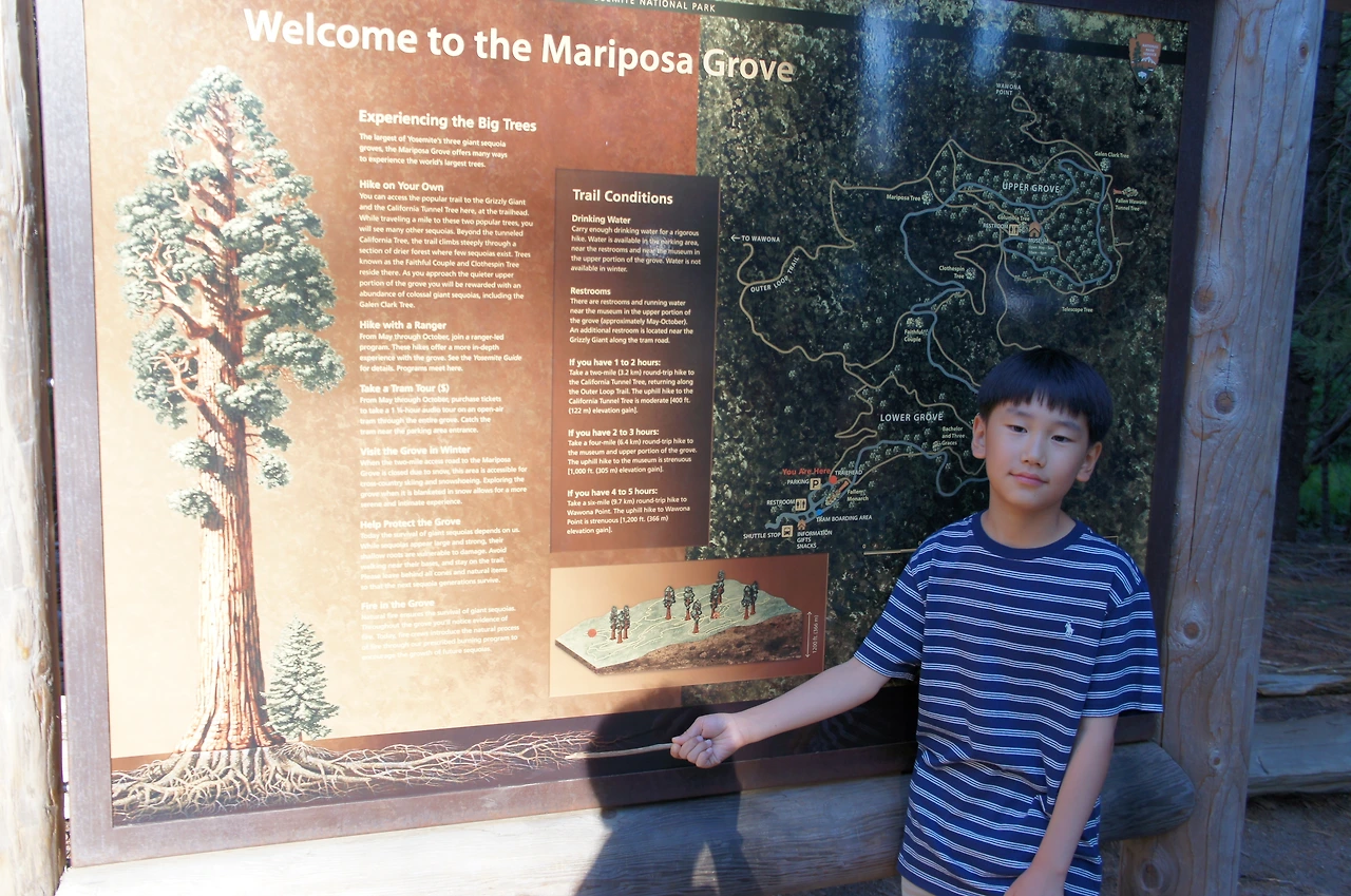 마리포사 그로브에 대한 설명 표지판 앞에서 찰칵.