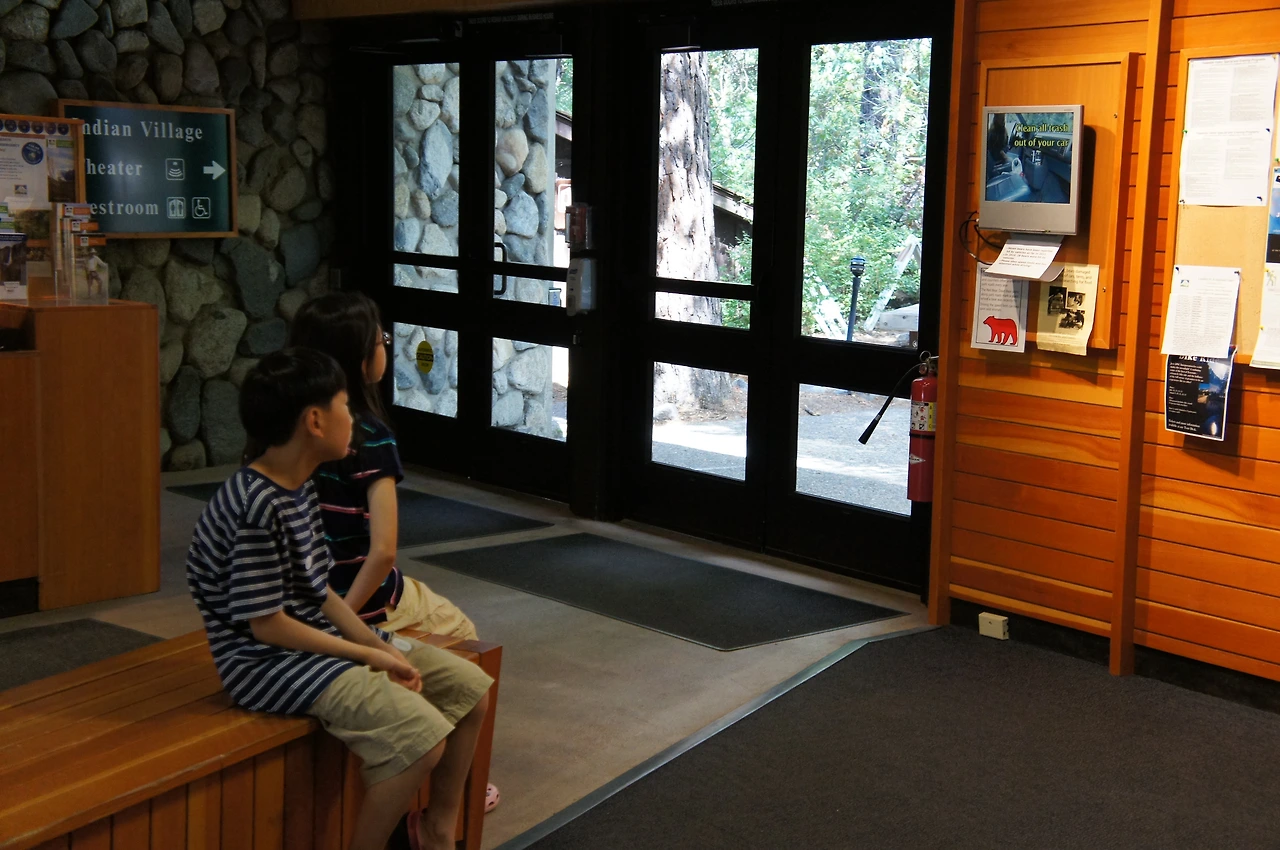 정말 어두워진 후에야 요세미티 국립공원에 도착할 수 있었다. 여행 전에 주의사항을 확인했는데, 요세미티 공원에는 야생 곰들이 많고, 특히 차 안에 음식을 남겨놓으면 유리창을 부수고 들어오기도 한다는 것이다. 숙소로 가는 내내 곰 얘기를 하며 갔는데 아니나 다를까... 숙소 키를 받으려고 들른 관리소 TV에 비디오가 나오고 있는데 글쎄 사람만 한 곰이 차를 흔들고 유리창을 깨고 차 안으로 들어가 먹을 것을 꺼내 먹고 있는 장면이 나오는 것이 아닌가... 그런데 그 비디오가 요세미티 주차장에서 찍혔던 거였다!