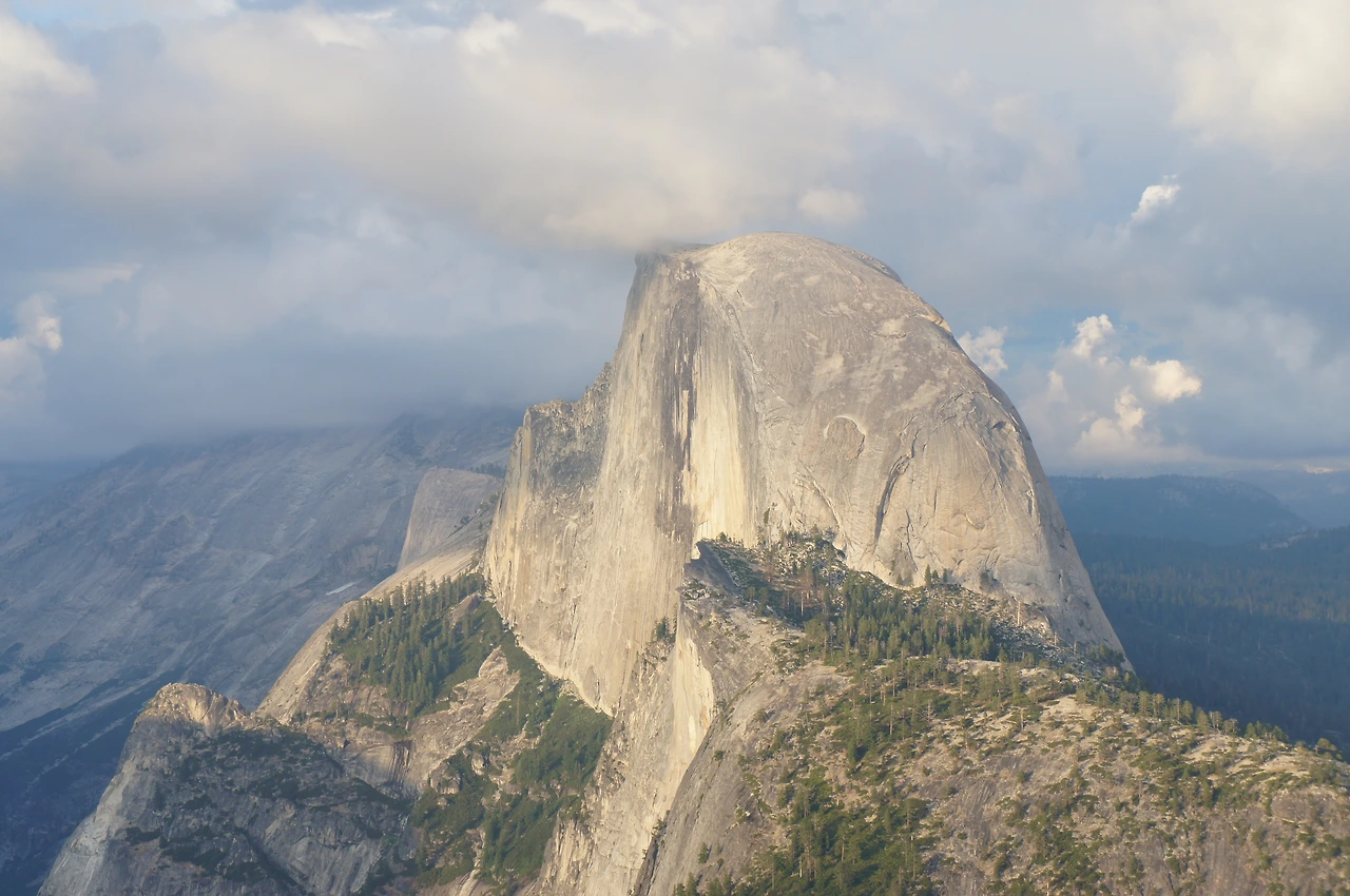 줌으로 당겨 찍어 더 가까이 보면, 날카로운 칼로 수박 쪼개듯 화강암 돔을 반으로 쪼개 놓은 모습 같다. 그래서 지어진 이름은 하프돔(Half Dome). ㅎ