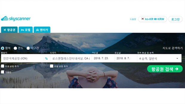 Sky scanner 사이트에 접속해 원하는 목적지를 누르고, 가는 날, 오는 날, 승객 수를 입력하고 검색을 합니다.
