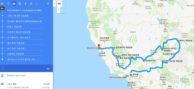 구글맵을 이용해 원하는 목적지의 이름을 한글로 입력하고 길 찾기 버튼을 누르고 추가를 계속해나가면 최대 10군데 목적지까지 루트를 표시해줍니다. 필자의 목적지들을 입력해보면, LA공항에서 샌프란시스코까지 총거리는 2188마일(3,521km)에 이르는 것을 알 수 있습니다. 이렇게 구글맵을 사용하면 내 여행 동선을 한눈에 확인할 수 있어서 입출국 공항과, 렌터카 픽업, 반납 장소도 결정할 수 있습니다. 필자와 같은 일정이라면 LA공항으로 입국해서 샌프란시스코 공항을 통해 출국하는 것이 훨씬 좋습니다. 렌터카도 추가 비용 없이 LA공항에서 빌려 샌프란시스코 공항에서 반납하면 되므로 시간과 돈이 절약되어 좋습니다.