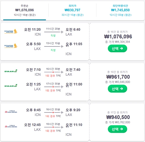 그러면 검색 결과가 나옵니다. (인, 아웃을 달리하려면 왕복이 아니라 다구간을 선택하면 됩니다) 추천순이 있고, 최저가가 있는데, 여기서 고려해야 할 것은 여행지 도착시간과 항공권 가격입니다. 가격이 좀 더 저렴하더라도 저녁에 도착하는 비행기라면 곤란합니다. 밤에 운전하는 것이 위험하거니와, 1박에 대한 숙박비가 추가로 들기 때문입니다. 공항에 아침에 도착하면 차를 빌려 그 날 저녁쯤에 1차 목적지인 그랜드캐니언에 도착할 수 있고, 저녁 식사 후 멋진 석양을 배경으로 사진을 찍을 수도 있으니 도착시간을 잘 봐야 하겠지요. 또 하나 팁은 직항이 아니라 다른 곳을 들렀다 가더라도 대기하는 시간이 길지 않고 아침에 도착하는 비행기라면 충분히 그 가치가 있습니다.