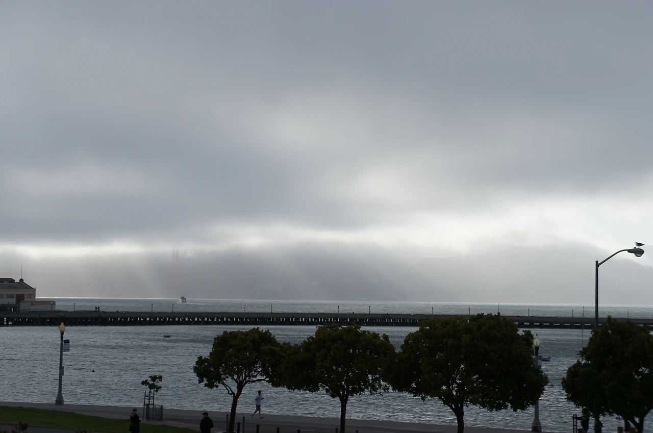 줄을 서서 우리 차례를 기다리다가 소살리토 쪽을 바라보니 구름 사이로 햇빛이 비처럼 쏟아져 내린다.