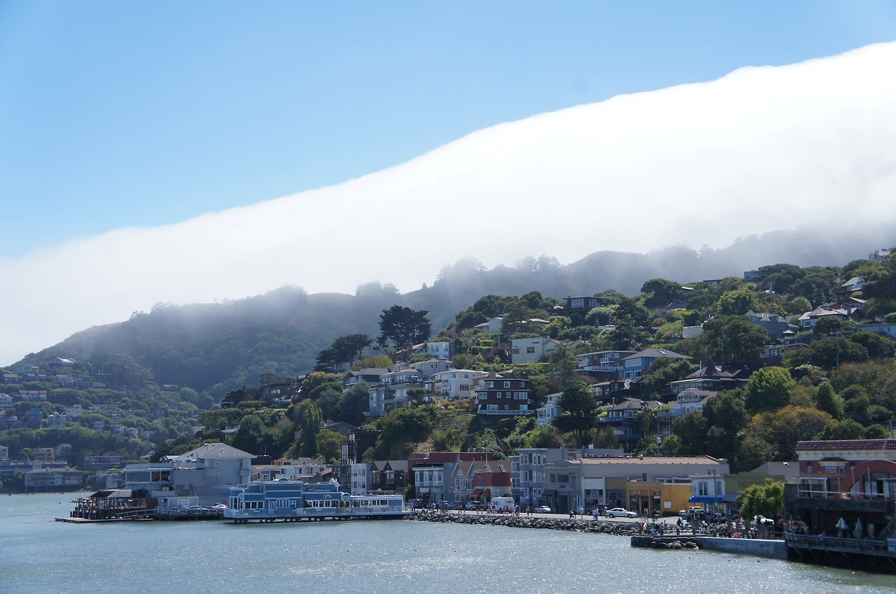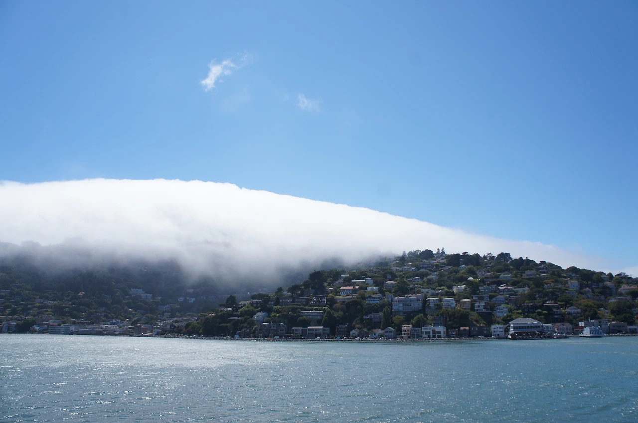 어제 우리가 피셔맨스 워프 식당에서 창문 너머로 보았던 구름인지 안개인지 했던 것이 소살리토 언덕을 스멀스멀 넘어온다.