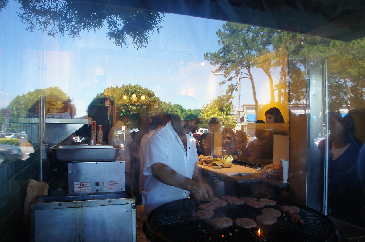 점심때가 되어 뭘 먹을까 고민하며 여기저기 둘러보는데 맛집처럼 보이는 곳이 시야에 들어온다. 간판도 그냥 햄버거, 심플하다. 가게도 작은데 정말 많은 사람이 모여 있다. 안을 보니 패티를 기름에 튀기지 않고 숯불에 구워낸다. 그게 비결이었을까?