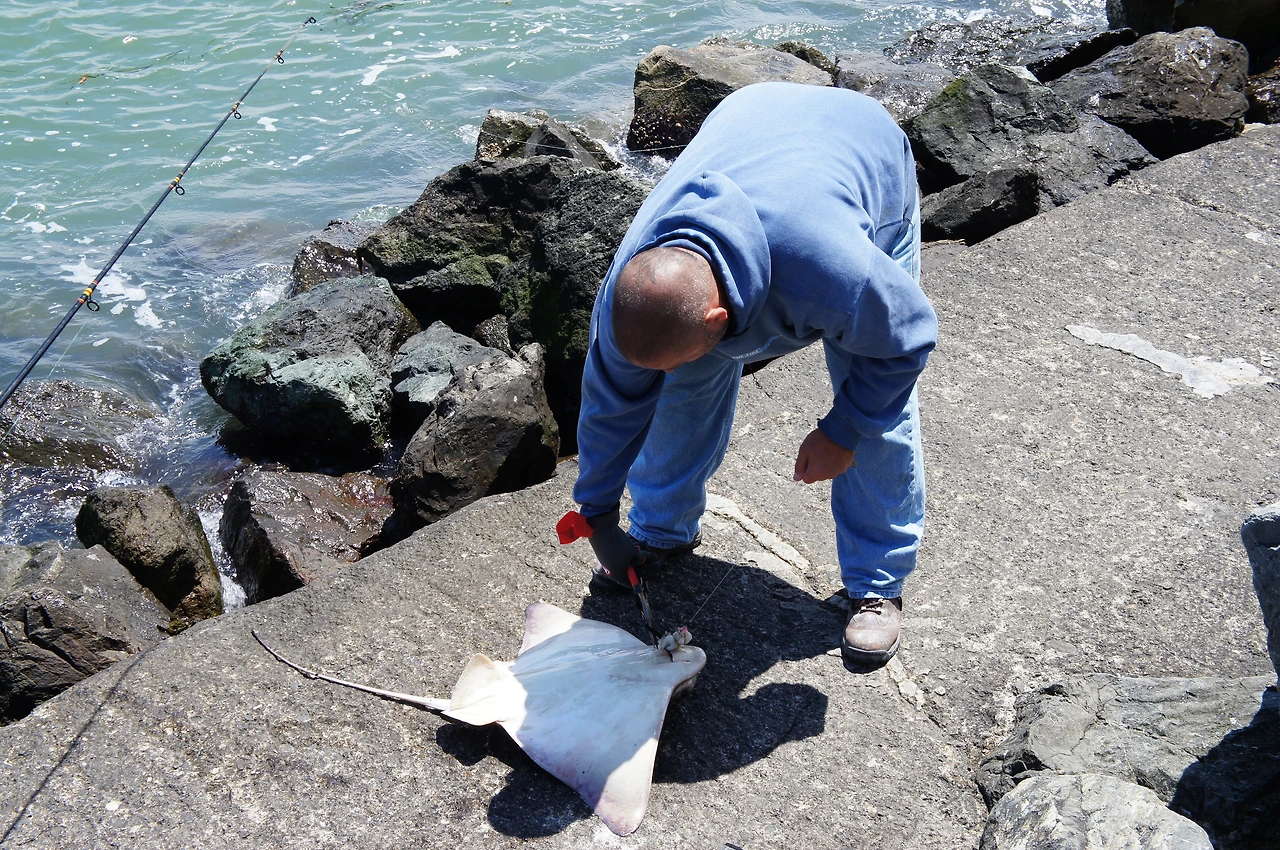 소살리토 바닷가에도 어김없이 강태공 아저씨들이 있다. 아저씨는 가오리를 잡았는데 먹지 못하는 거라 그랬는지 바다에 바로 방생한다.