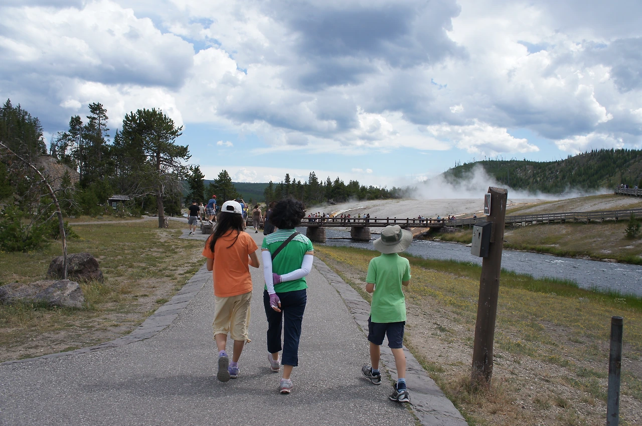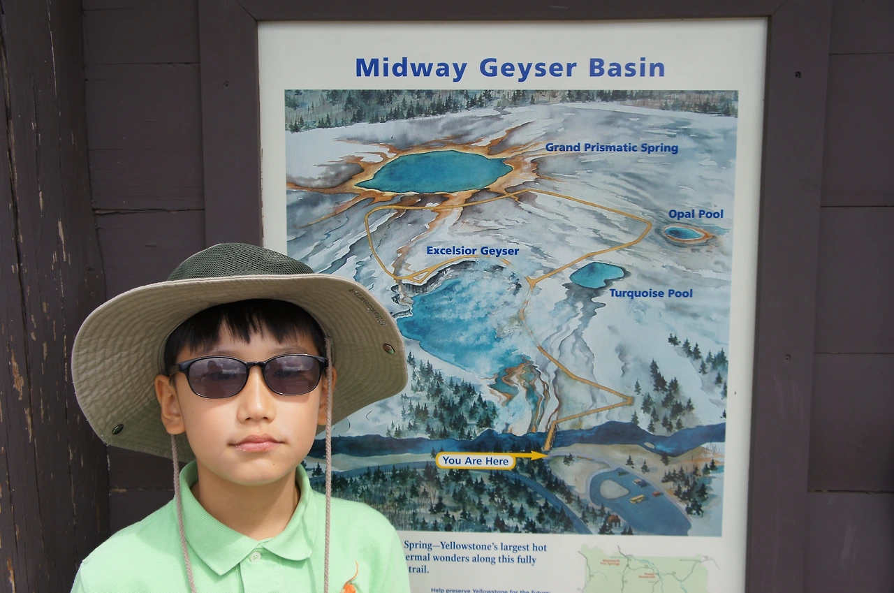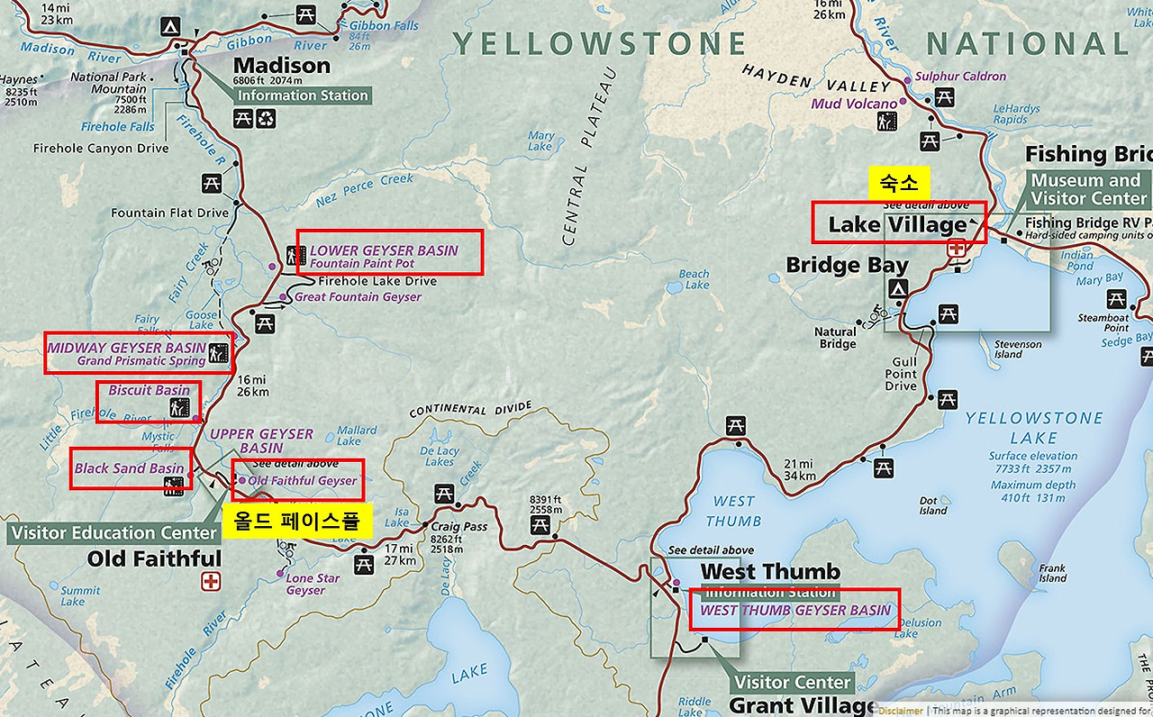 올드 페이스풀 지역을 둘러본 우리 가족은 근처에 있는 블랙샌드(Black sand) basin, 비스킷(Biscuit) Basin 지역을 둘러보고 미드웨이(Midway) 가이저 베이신, 파운테인 페인트 팟(Fountain Paint Pot) 지역까지 올라갔다가, 숙소로 돌아오는 길에 웨스트 썸(West Thumb) 가이저 베이신을 둘러볼 예정이다. 참고로 옐로스톤 국립공원의 지도를 보면, 숙소로 부터 올드 페이스풀 지역까지는 약 70km 떨어진 거리에 있으며, 올드 페이스풀 위쪽으로 엄청나게 많은 가이저 베이신들이 몰려있음을 알 수 있는데 이 지역이 바로 옐로스톤의 심장부라고 할 수 있다.